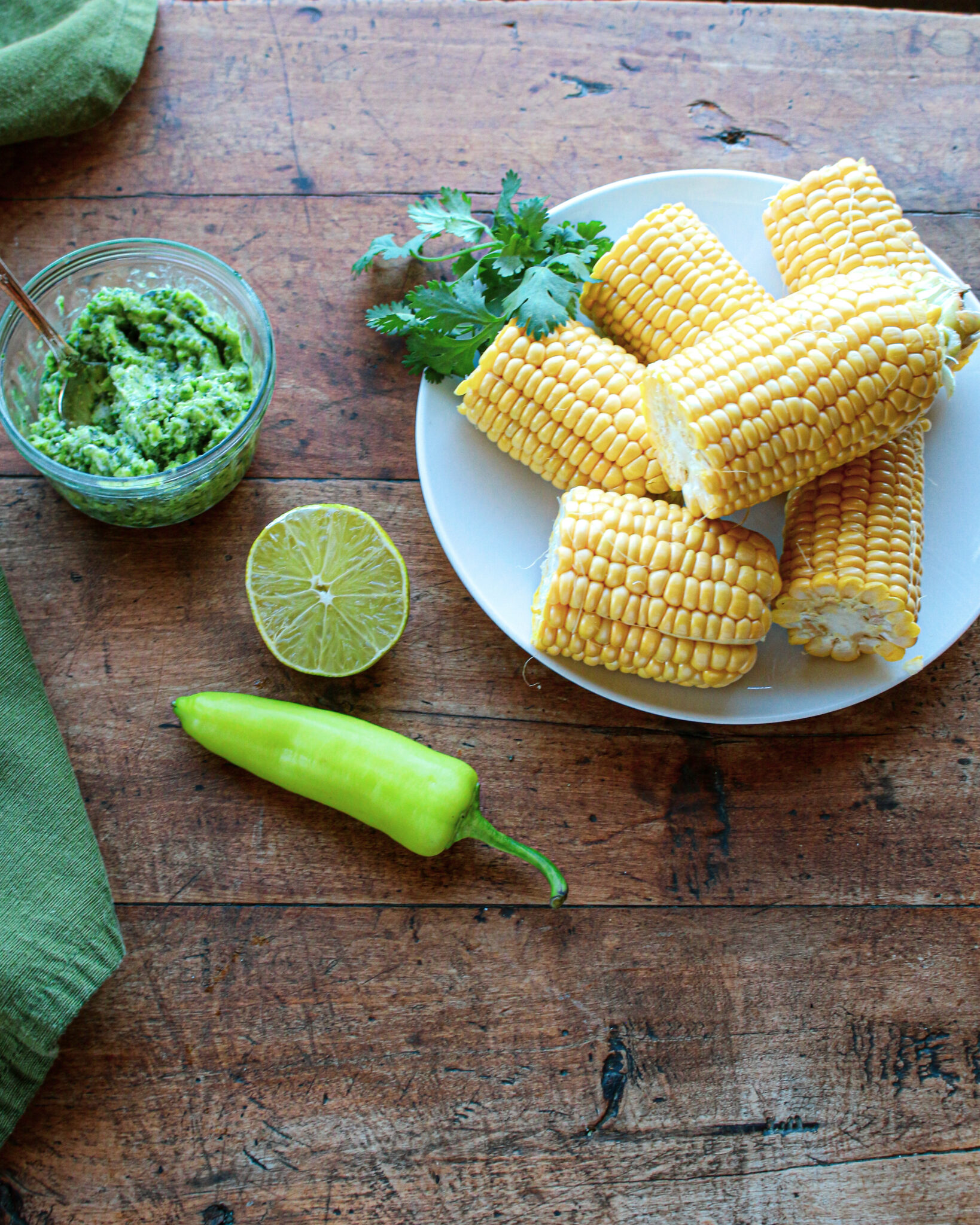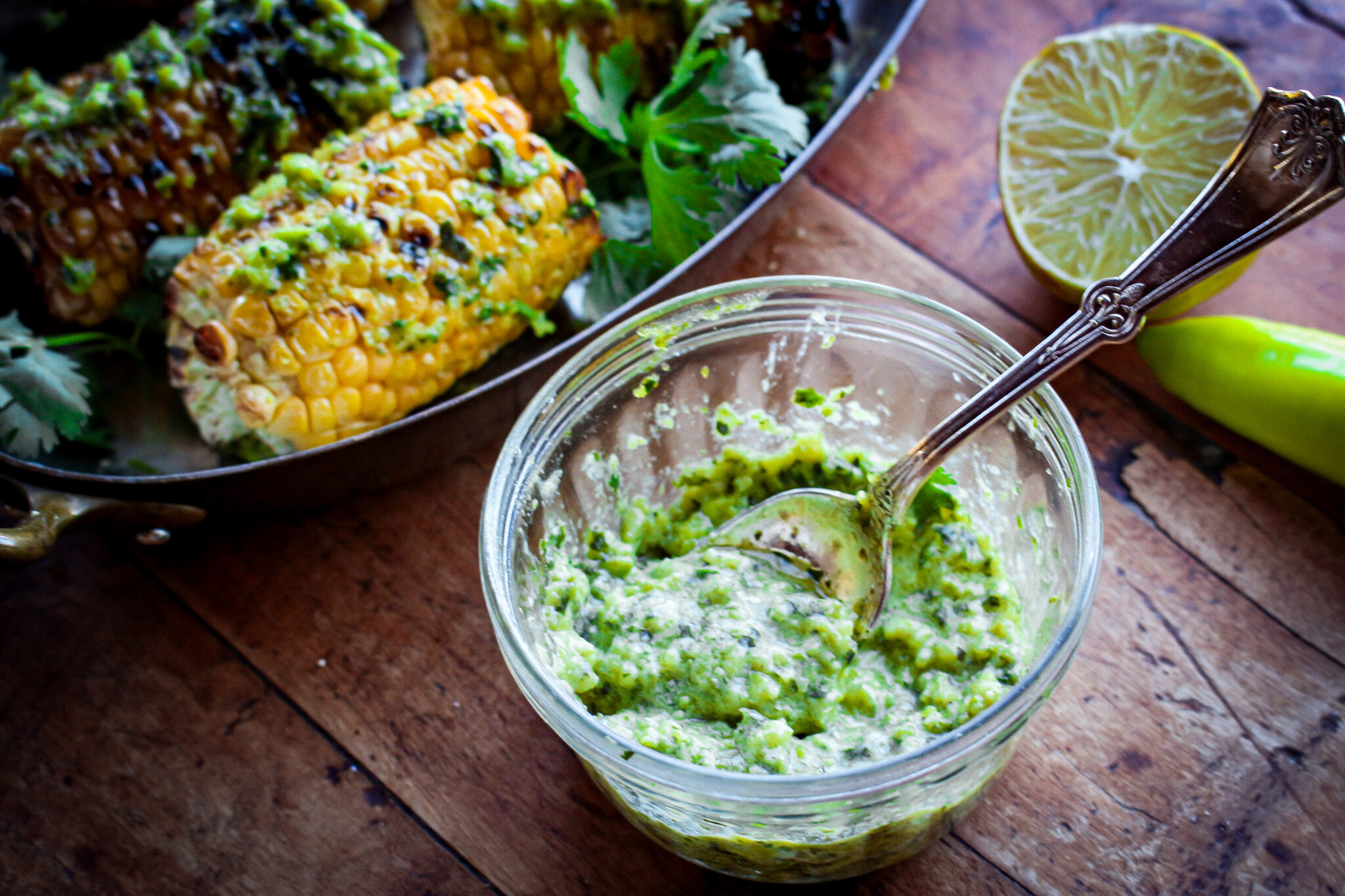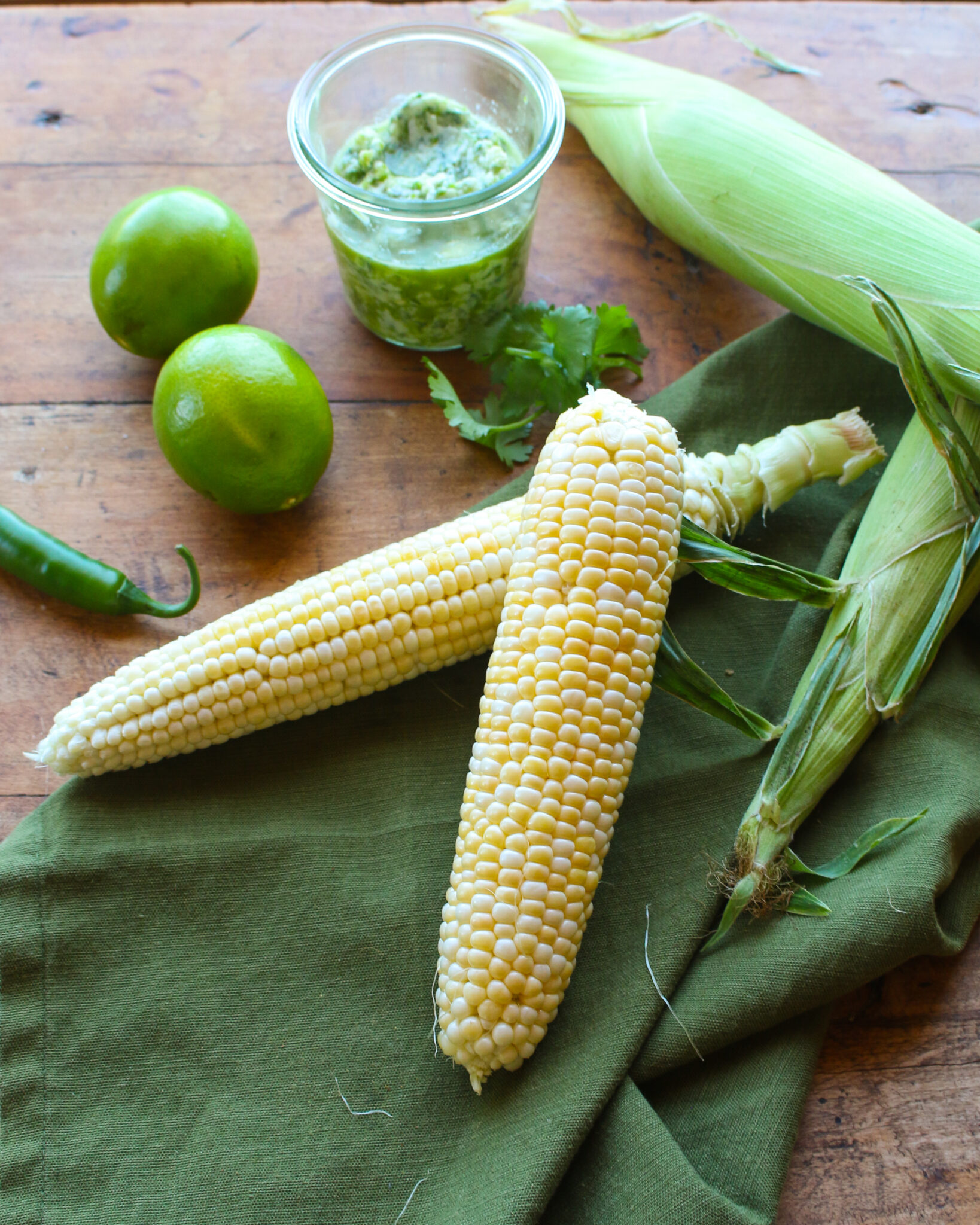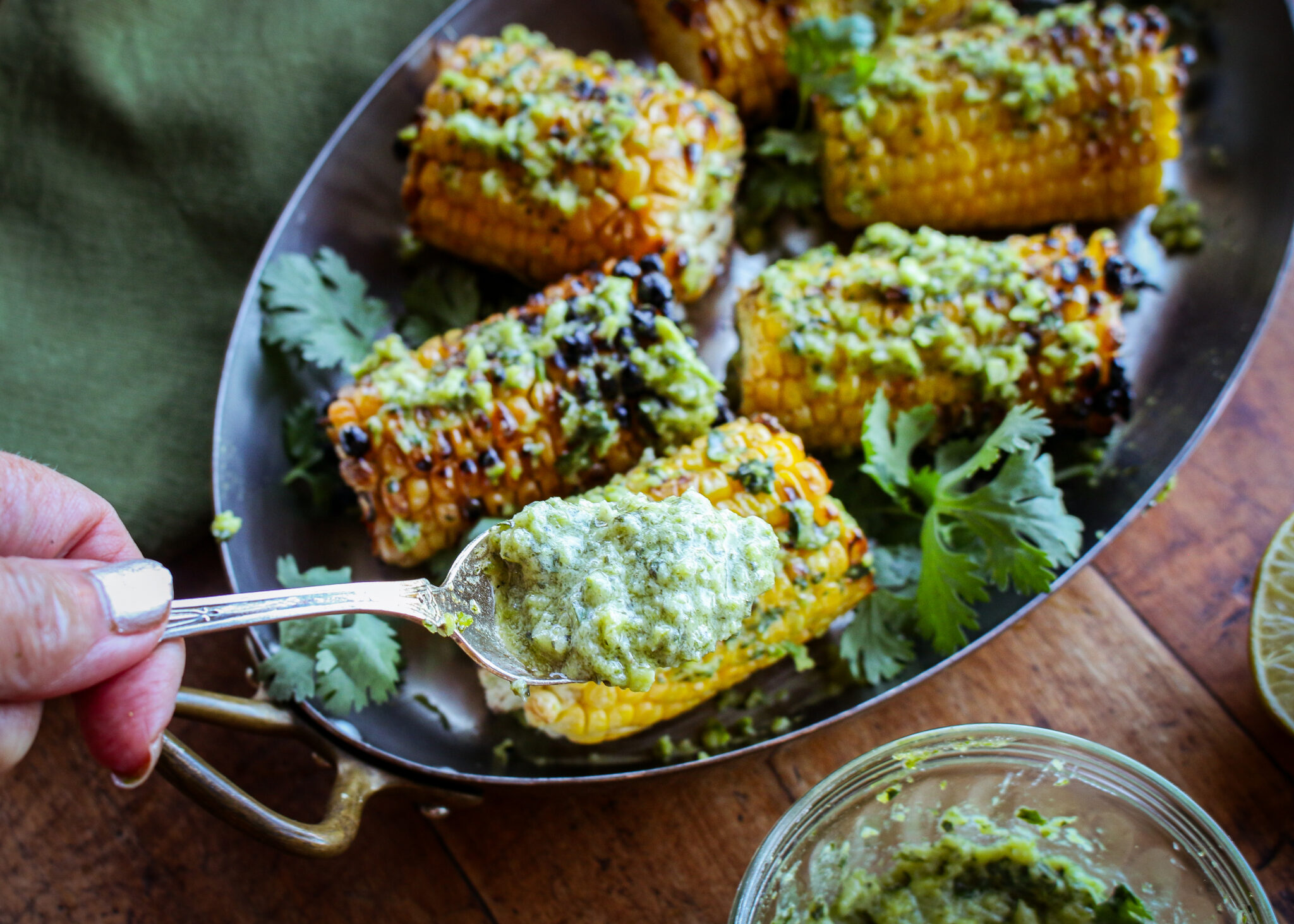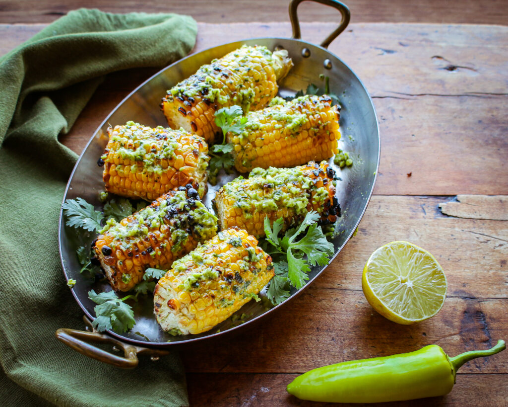 - When corn is done cooking, place on a platter or baking dish, and brush the Lime Cilantro Topping evenly over the surface of the hot corn, allowing it to melt.