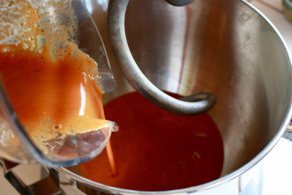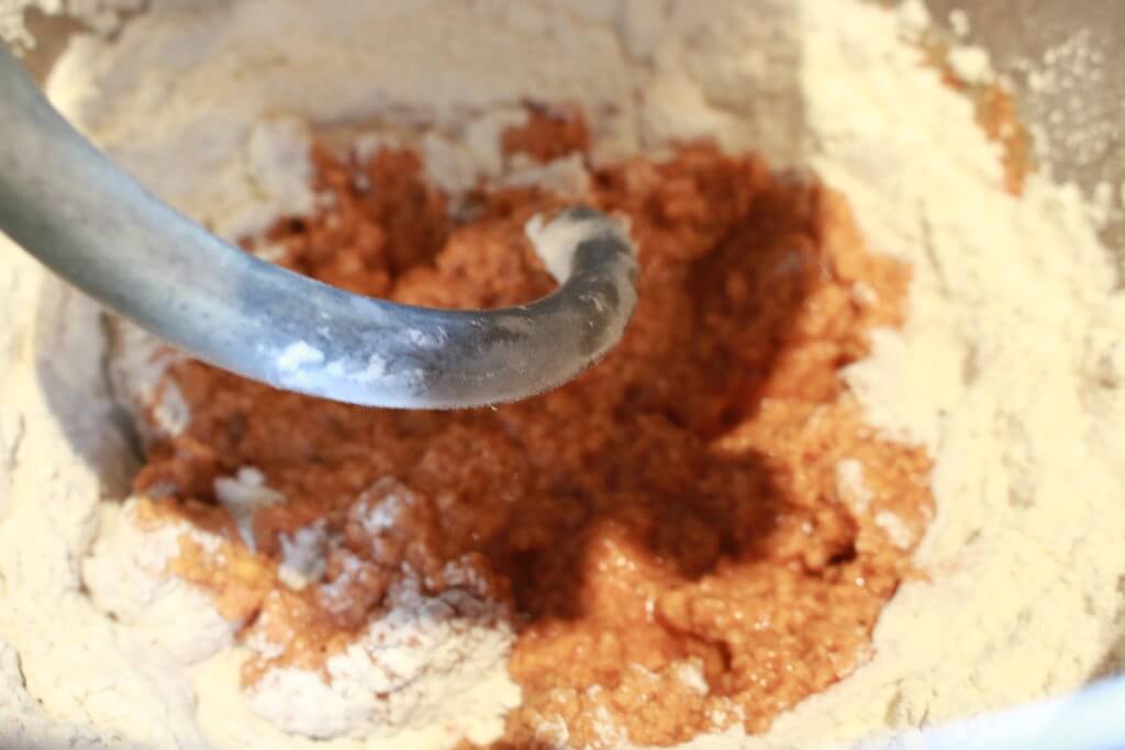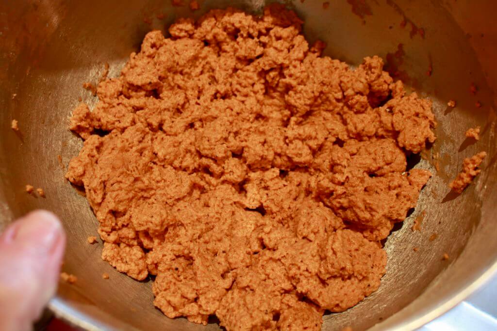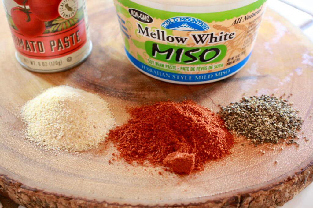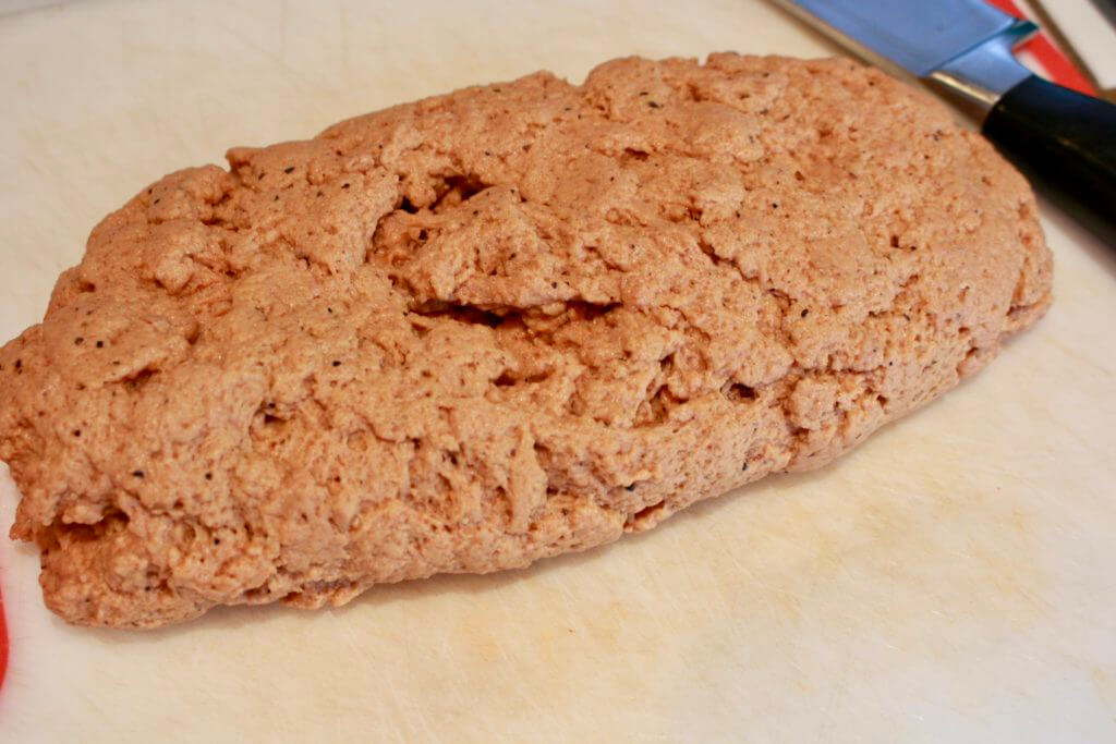 To make Dough: Add water, soy sauce, tomato paste, miso paste, chili powder, garlic powder, and black pepper in a blender. Process until smooth. Pour into a large bowl (try a standing electric mixer). Add vital wheat gluten flour and nutritional yeast and mix with an electric mixer using the pastry hook (or by hand with a spoon) until well combined and it starts to look saggy and stretchy. Knead with electric mixer or by hand for 1 minute. Transfer dough to a cutting board.