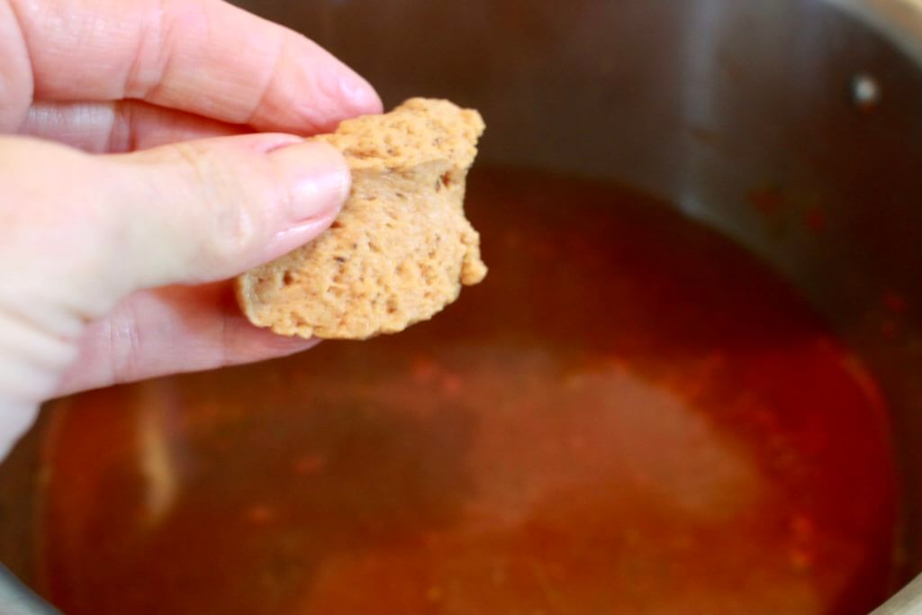 Add pieces of dough to the simmering broth. Cover increase heat to medium and cook, stirring occasionally until pieces rise are fluffy and rise to the top (about 1 hour). Serve with broth immediately. Or transfer seitan with broth to an airtight container and refrigerate to use for the next 6 days in recipes. May freeze for up to 3 months.