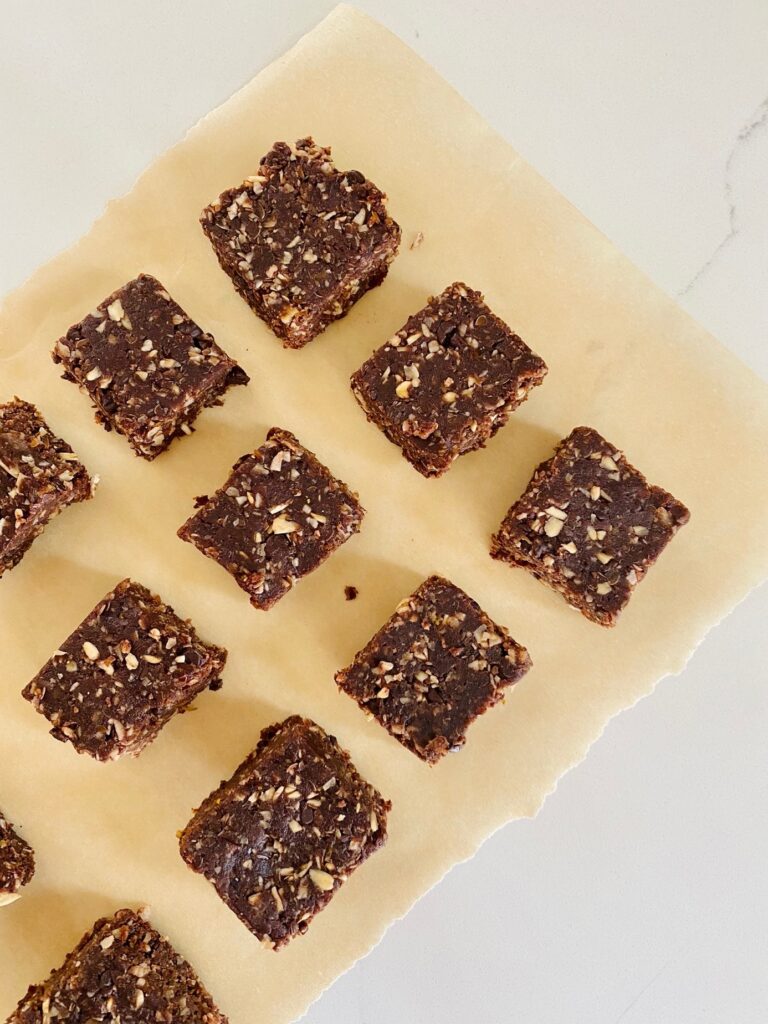 - Transfer mixture into the lined dish and press it firmly and evenly into the dish. Allow it to sit in the refrigerator for 30 minutes. Cut into 36 bites. Store bites in the refrigerator or freezer.