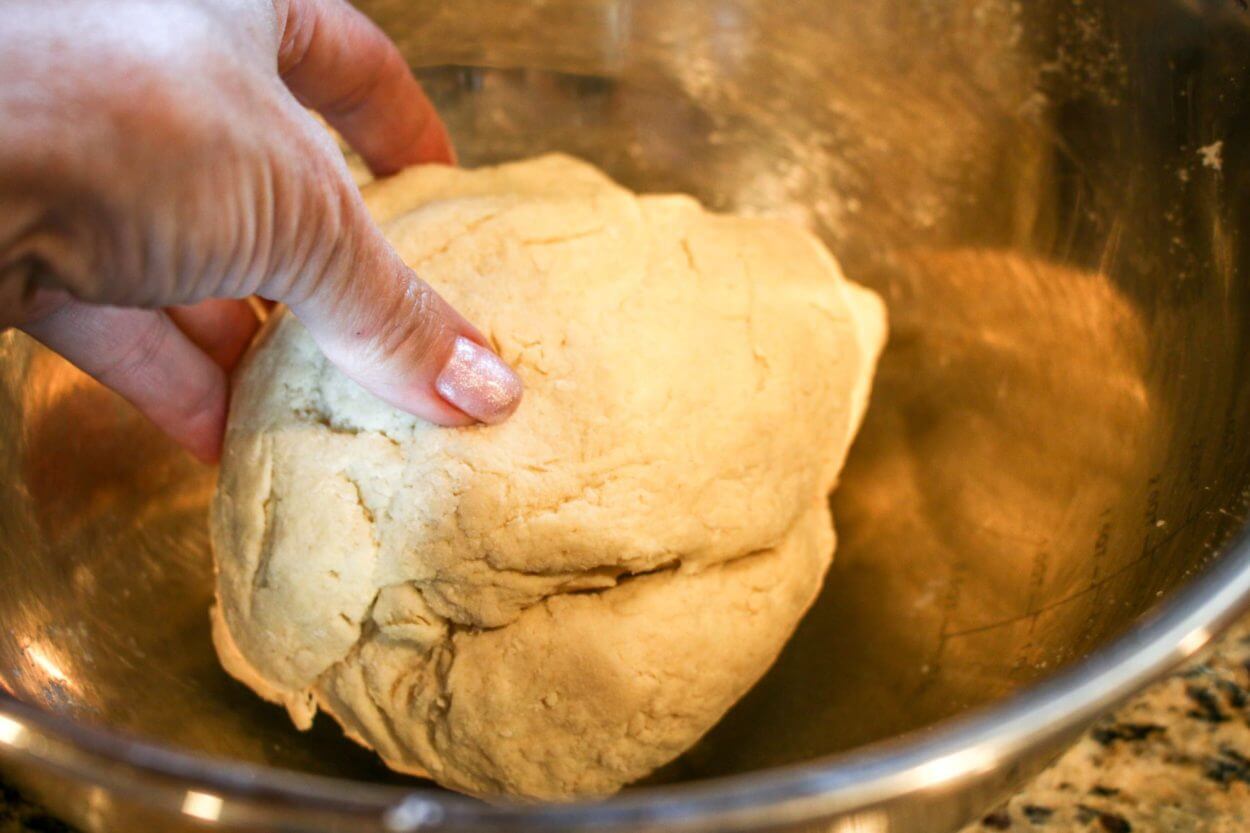 Add the water, just a little bit at a time, working and kneading it in with your hands, until you create a cohesive dough that is slightly sticky to the touch.