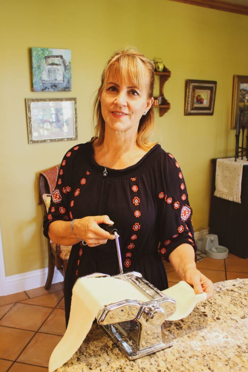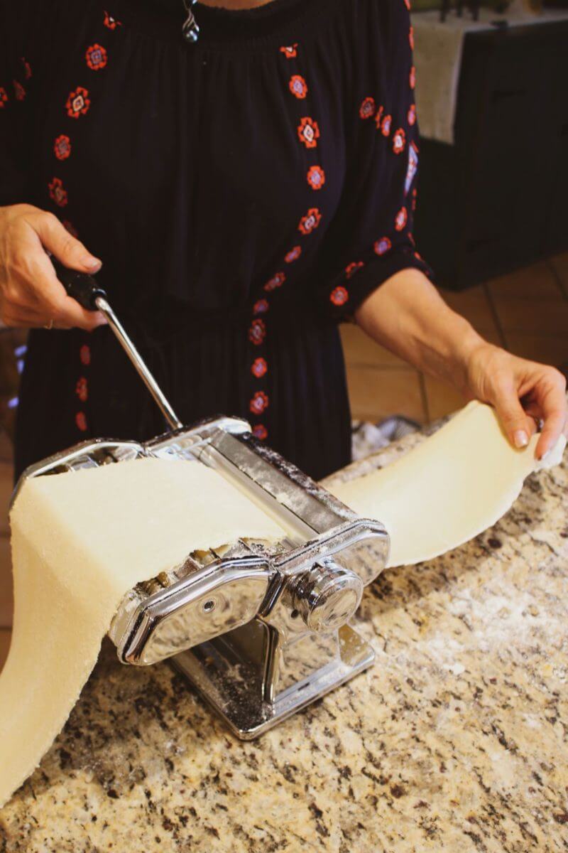 Rolling out the pasta sheets by hand.