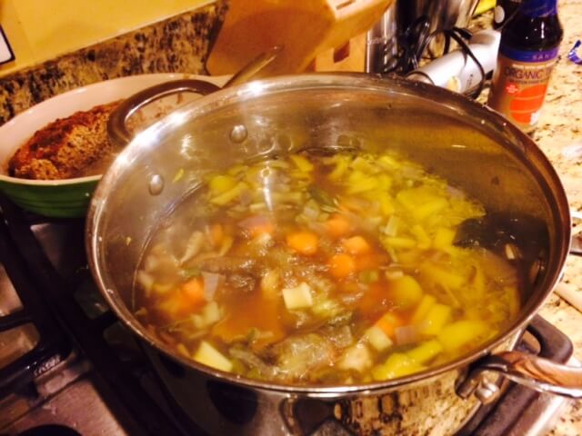 Remove the contents from the pot, strain the broth through a strainer or sieve, and voila—you have a wonderful vegetable broth! This recipe should make about 7 cups. Save the strained vegetables for another time in soup or stew.