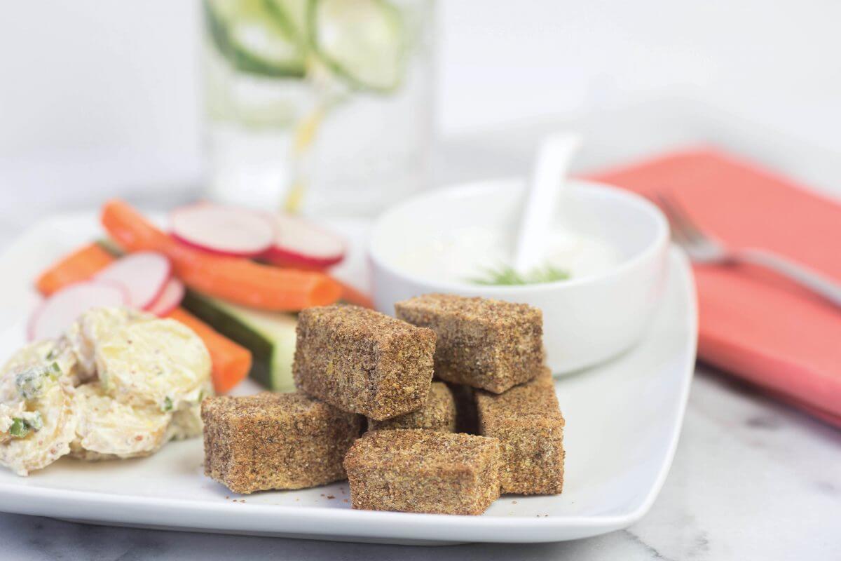 Roll tofu in breading mixture to coat evenly. Place nuggets on parchment lined baking sheet. Bake for 25-30 minutes.