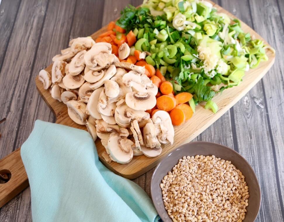 Chop mushrooms, carrots, celery, leeks, and garlic. Measure out pearled barley.Add all ingredients to Instant Pot and push Soup/Broth setting on the Instant Pot.When setting is done, release press, and serve soup.