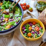 - Add lettuce, cabbage, jicama, tomatoes, cucumber, onion, green olives, and chickpeas to a large salad bowl and gently toss.