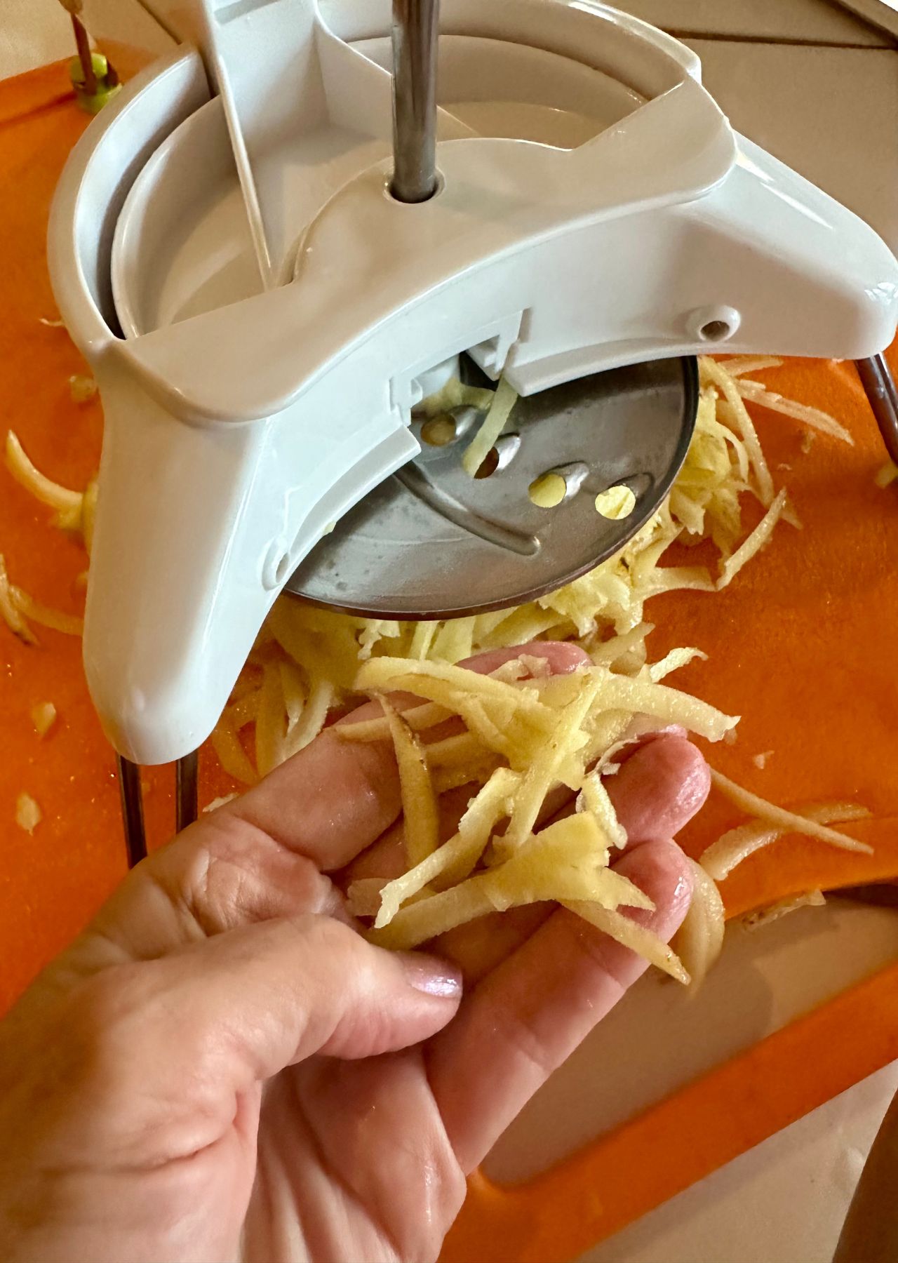 This hand held shredding device with attachment is commonly used in Sweden to make Jannson’s. I bought it there, but you can find it online here.Print