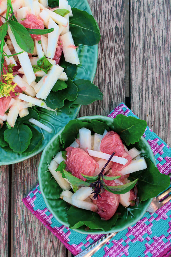 - In a mixing bowl, mix together grapefruit, jicama, and basil.