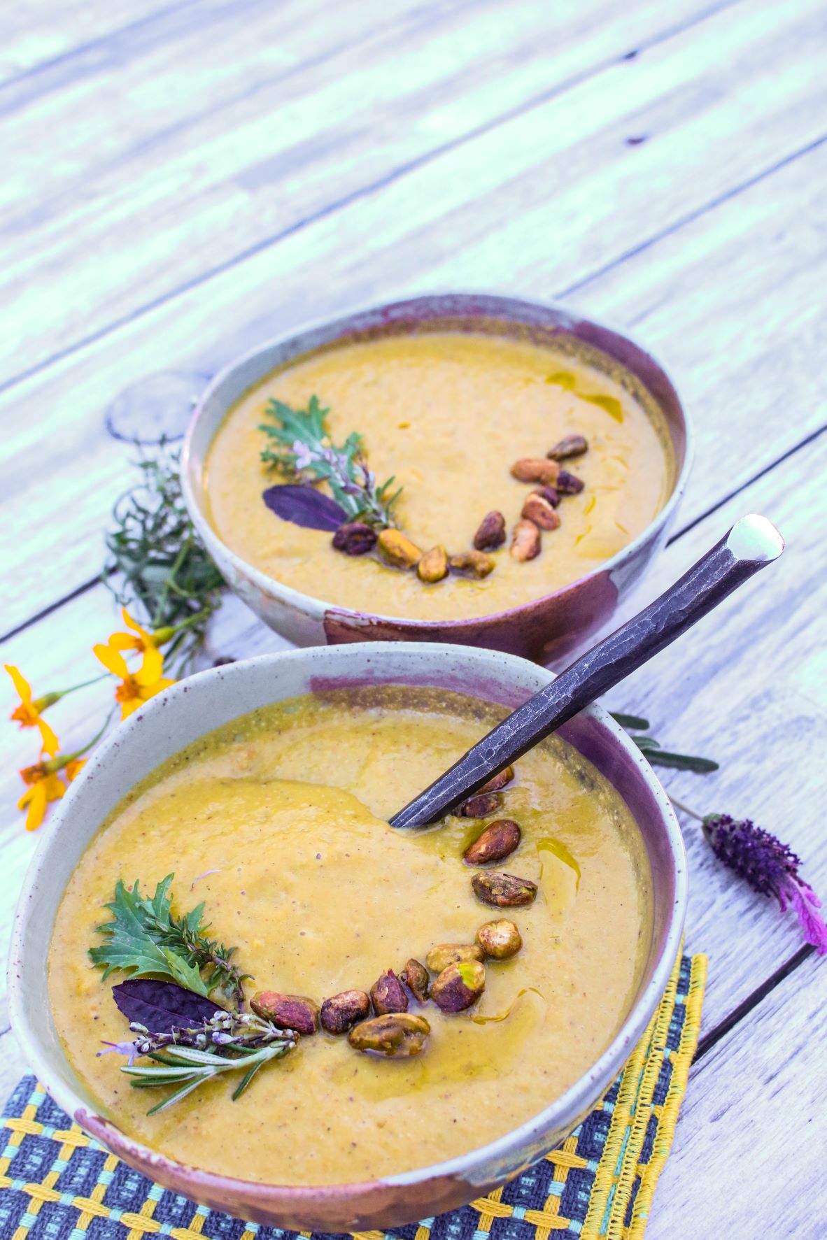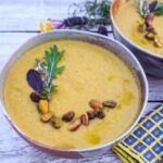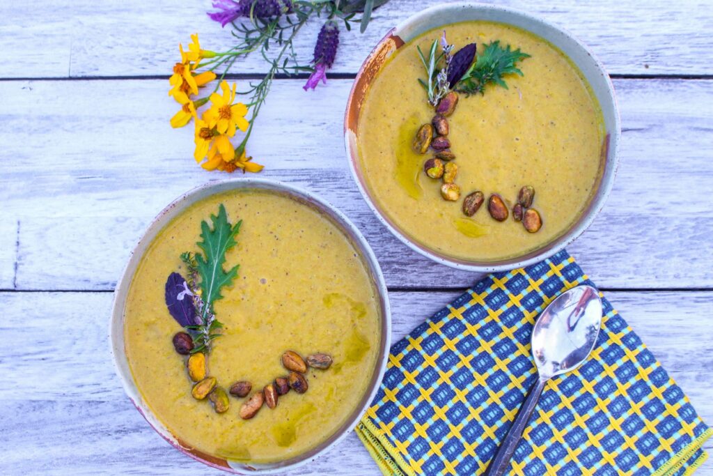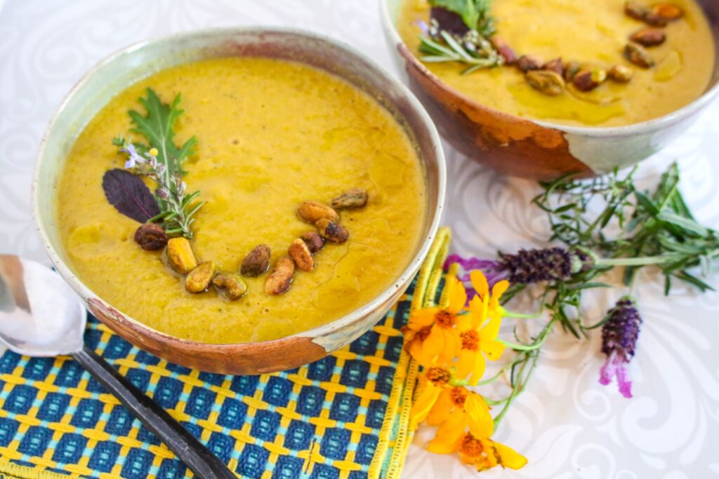 This creamy, plant-based, gluten-free Kabocha Squash Leek Soup is resplendent with the rustic flavors of winter squash, leeks, pistachios, and herbs.