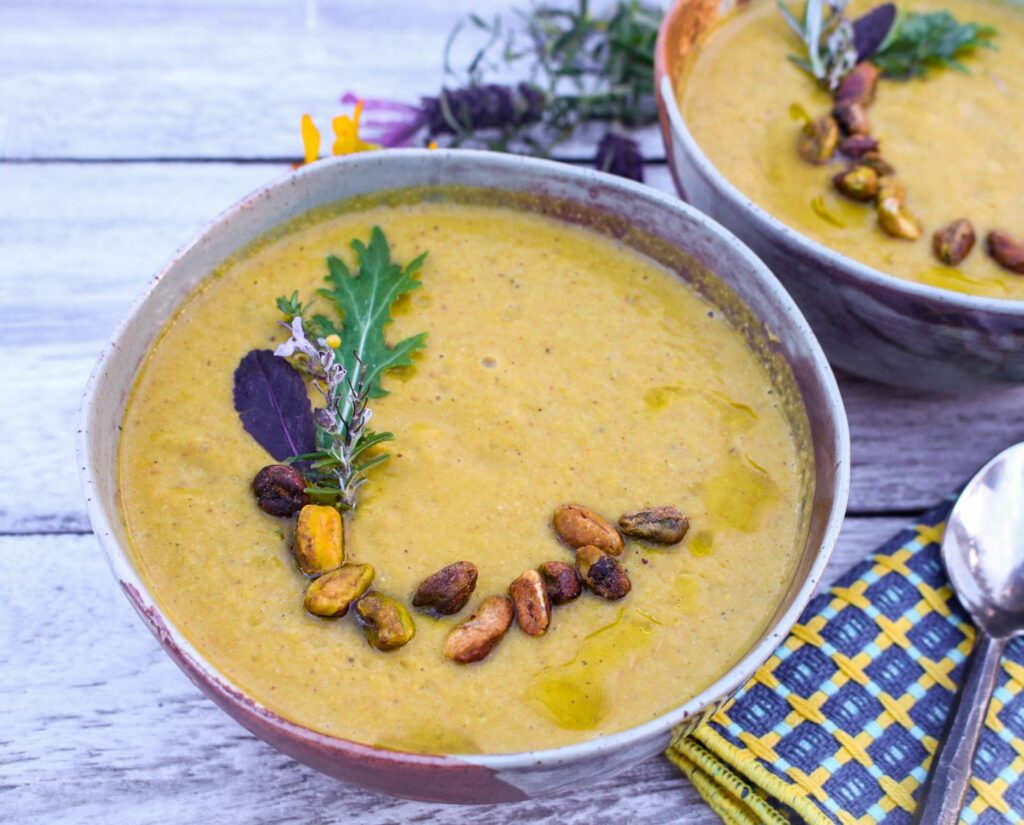 - Add plant-based milk. Use immersion blender and blend soup until smooth and creamy (or place soup in a blender container and puree). Add salt and pepper (if desired). Turn on medium heat to bring soup just to a simmer. Remove from heat. Serve in bowls and garnish with additional pistachios if desired.