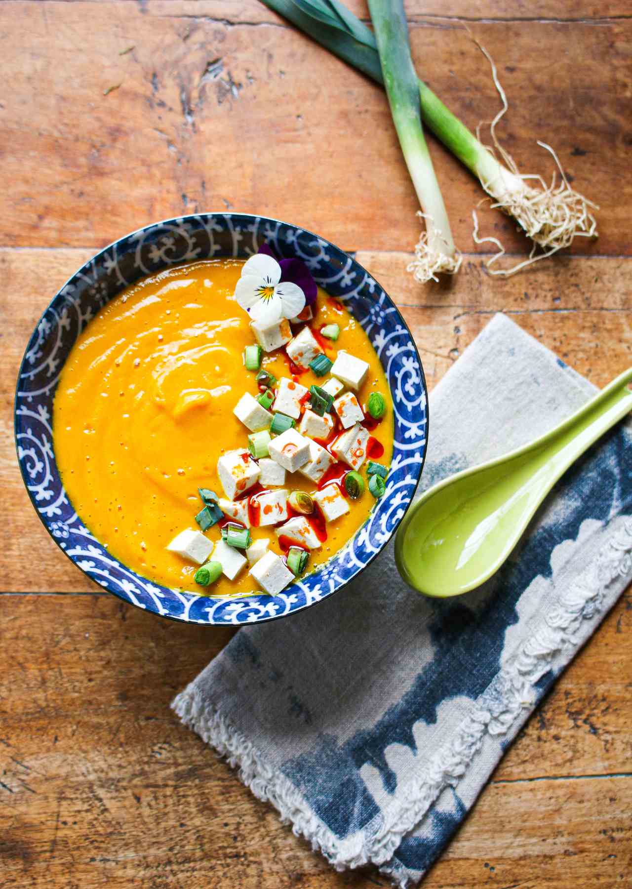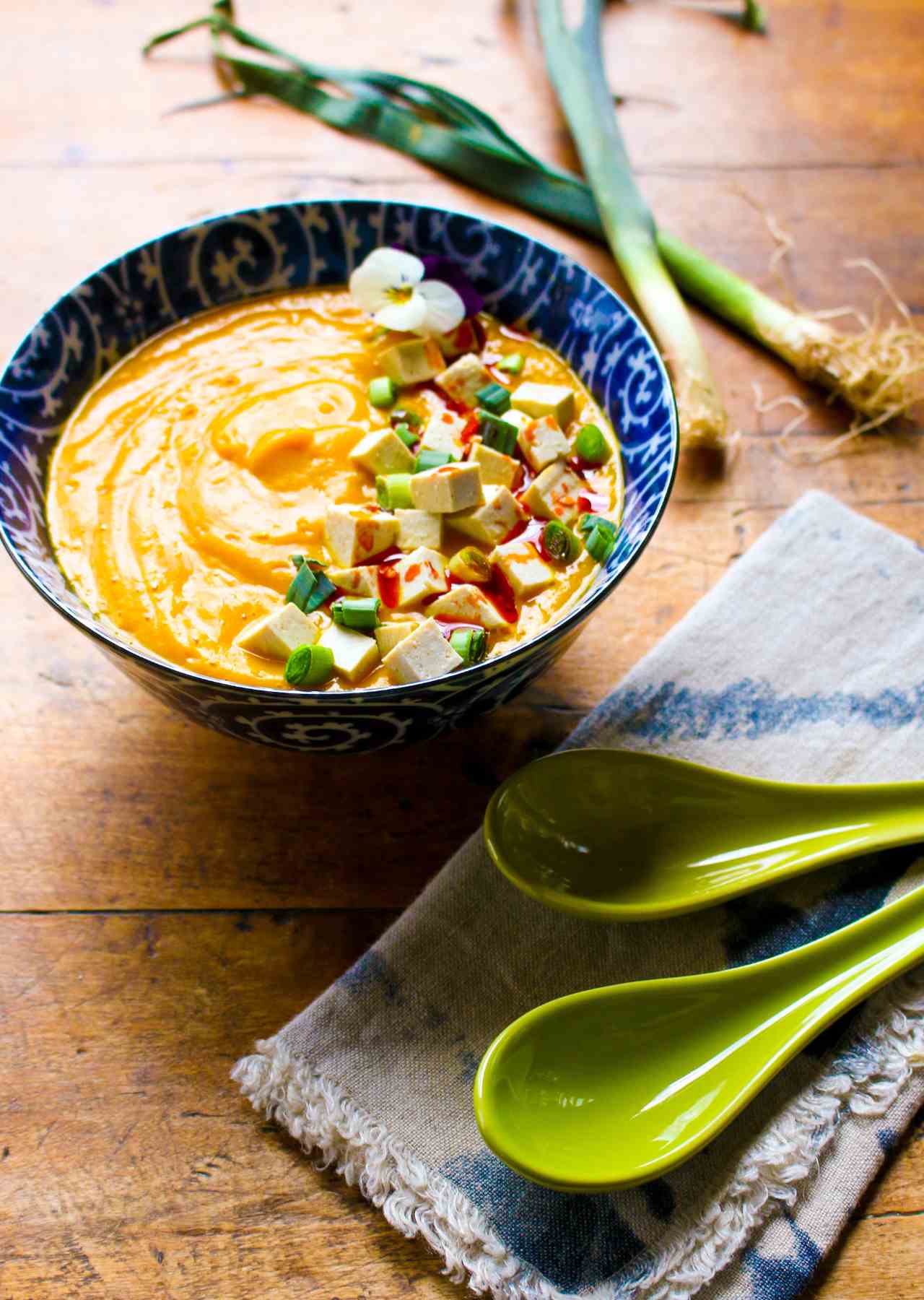 Divide soup among 4 small bowls (about 1 1/4 cups per serving) and top with 1/4 cup tofu, 1 tablespoon green onions, and a drizzle of chili oil (optional). Serve immediately.