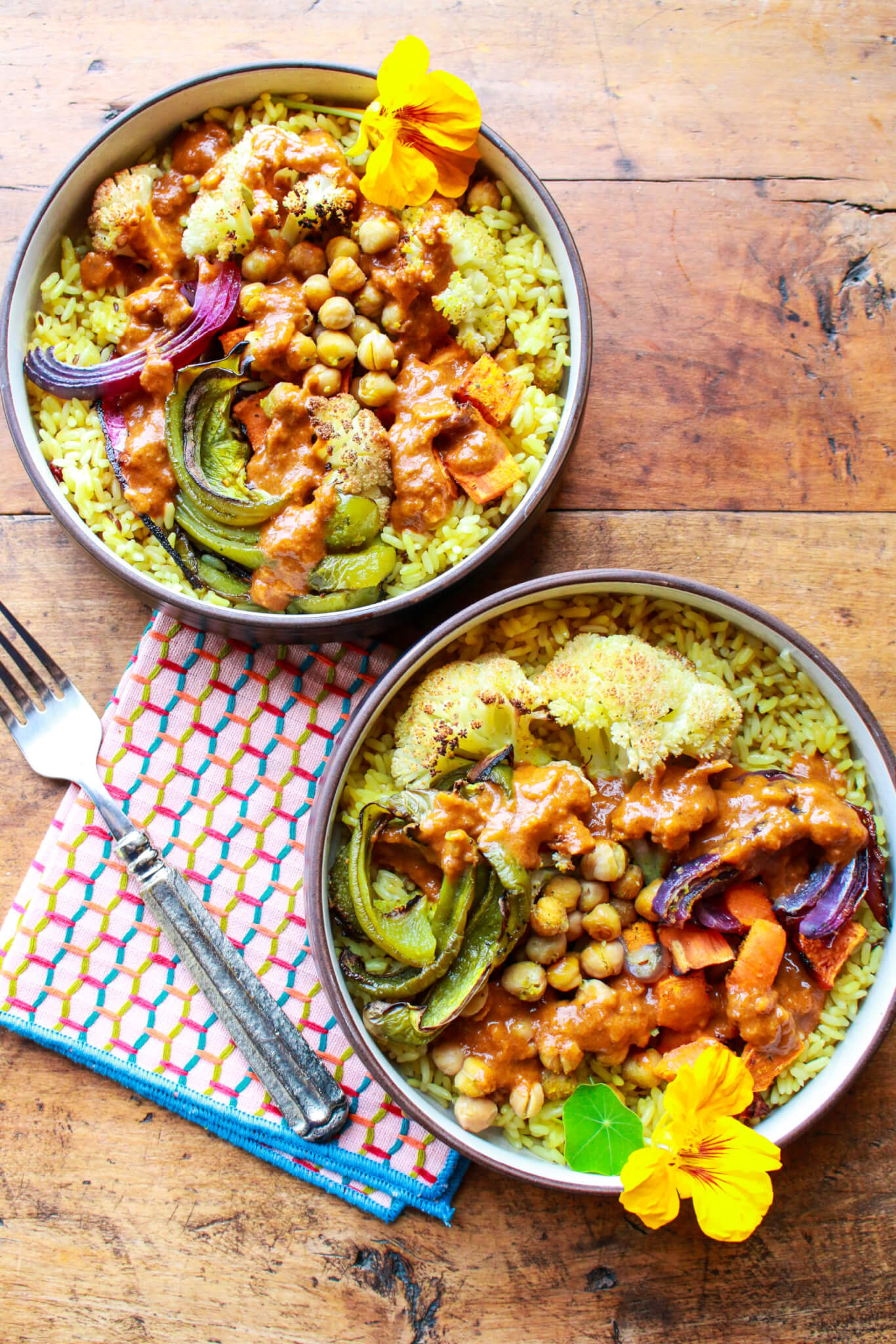 Get an amazing, flavorful, plant-based (vegan), gluten-free grain bowl on the table in under 45 minutes with this fabulous turmeric rice, sheet pan roasted veggies, and easy korma sauce.