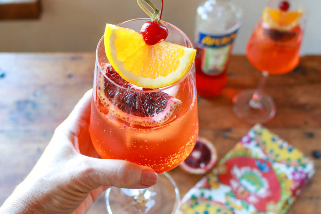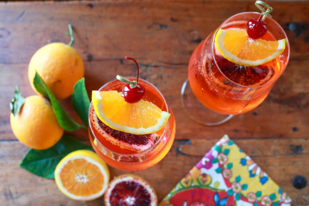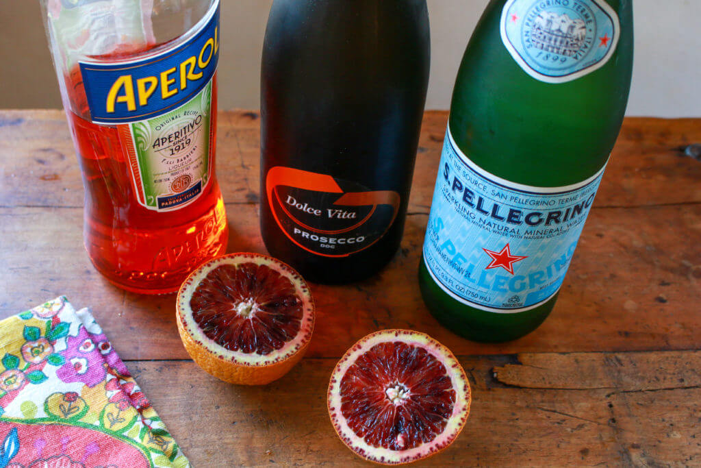 This drink is based upon Aperol, a liqueur that dates back to 1919 in Italy. It’s a bright orange liqueur made of bitter and sweet oranges, with herbs and roots added to the mix. It has 11% alcohol content. An Aperol Spritz is simply ice, Prosecco (Italian sparkling wine) and soda. In my lightened up version, I swap out soda for mineral water, and use a little less alcohol. Of course, it must be accompanied with an orange slice to give it that festive look. These oranges in my Aperol Spritz are from my very own blood orange tree at home.