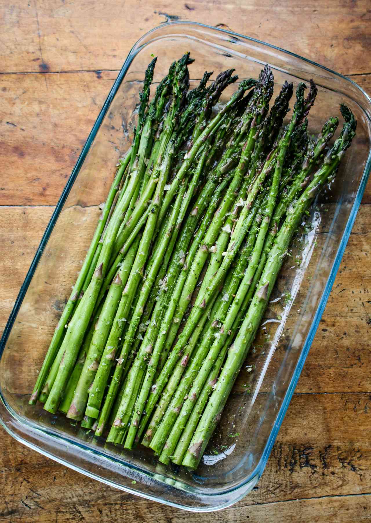 - Sprinkle the lime zest, salt (optional), and black pepper over the asparagus.