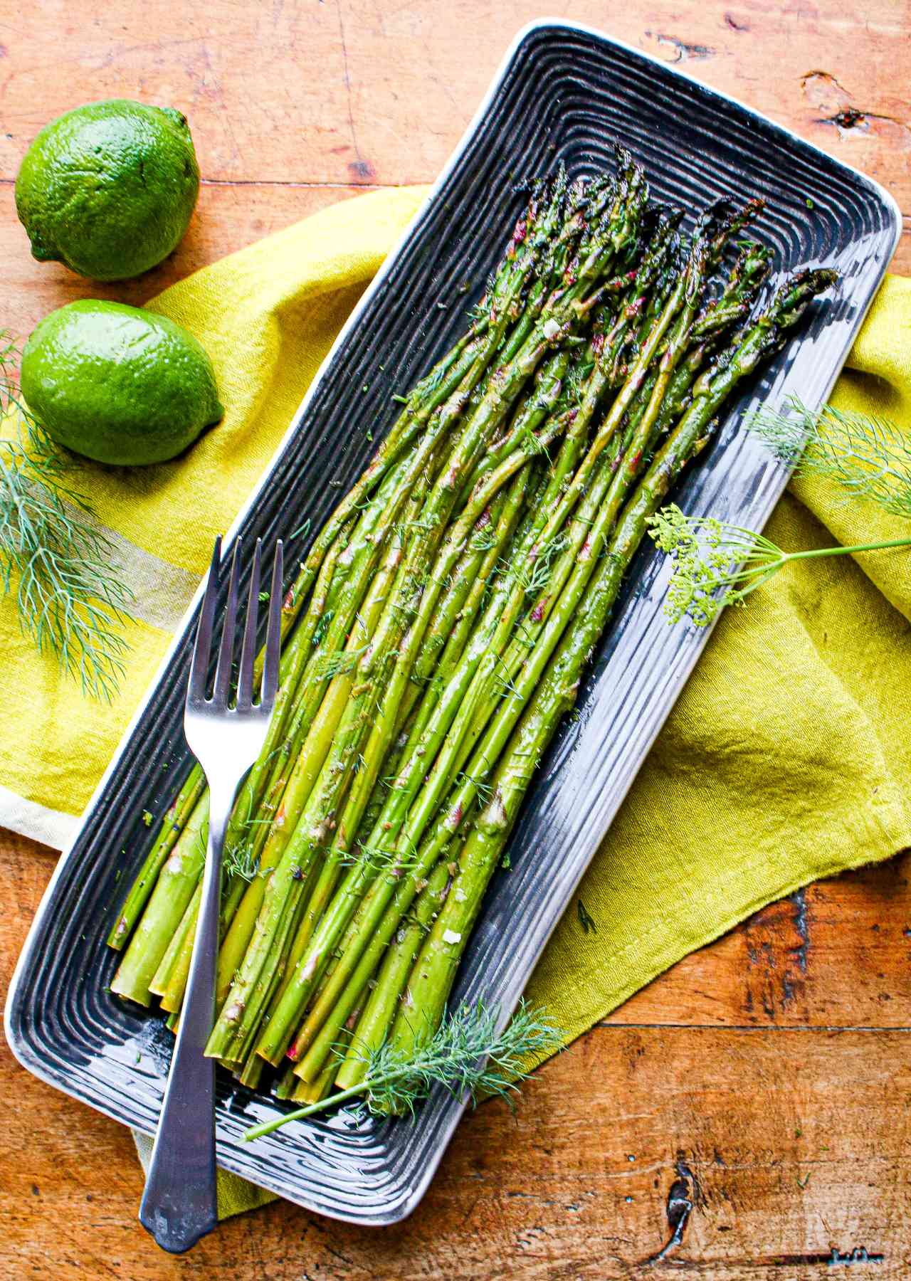 - Zest the lime peel (finely shred outer surface of lime with a zester or microplane) and set aside. Squeeze the lime juice and drizzle it evenly over the asparagus.