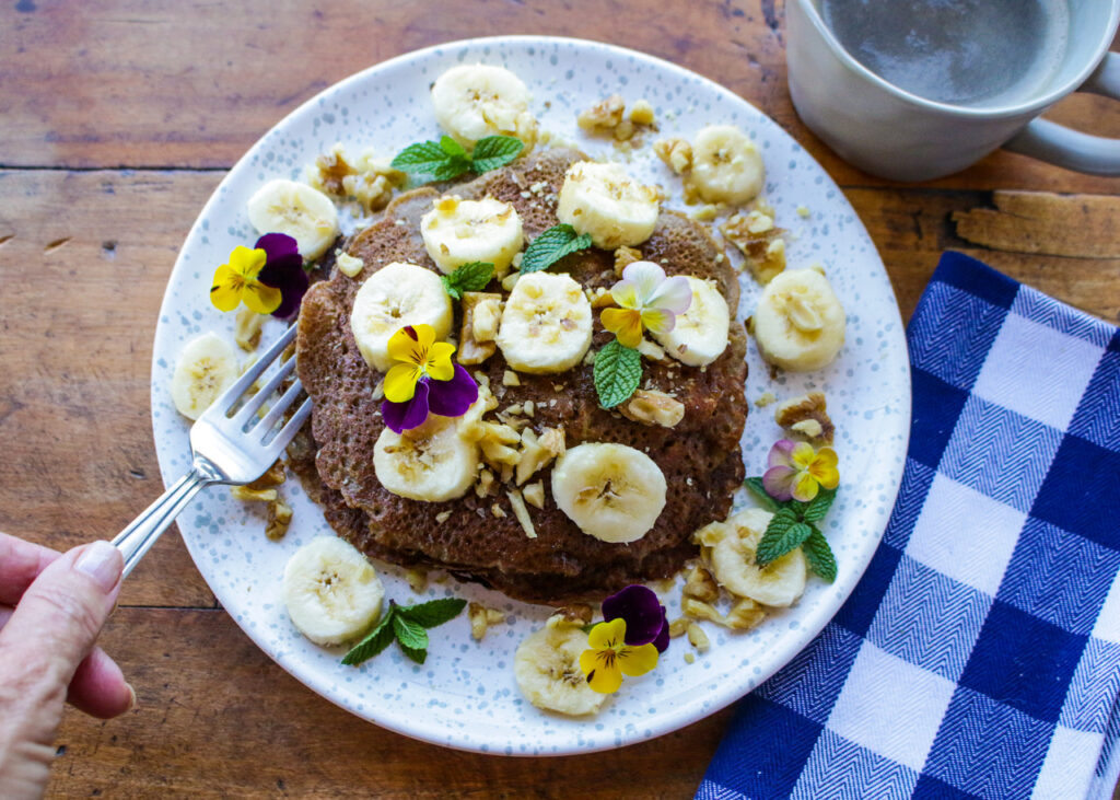 Are you looking for some new vegan breakfast ideas? I’m sharing one of my favorite classic vegan breakfast recipes I make in my own home on the weekends. You won’t believe these light, tender, flavorful banana pancakes are both gluten-free and vegan. And you really won’t guess what their magic ingredient is…chickpeas! These Magic Vegan Banana Pancakes are magic because they use the power of aquafaba, banana, and chickpea flour to produce entirely light, delicious, wholesome pancakes that can satisfy young and old palates alike. Plus, they are naturally low in sugar and added oils, and packed with the plant power of pulses, walnuts, and bananas. You’re welcome!