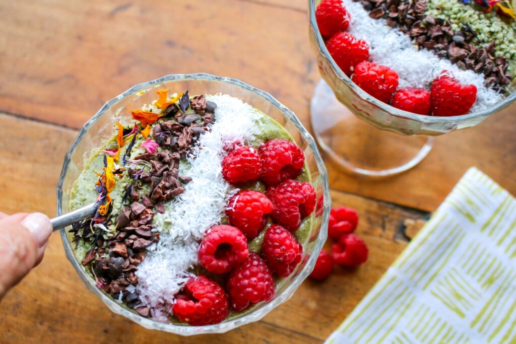 Arrange with toppings: coconut, cocoa nibs, hemp seeds, berries, as desired.