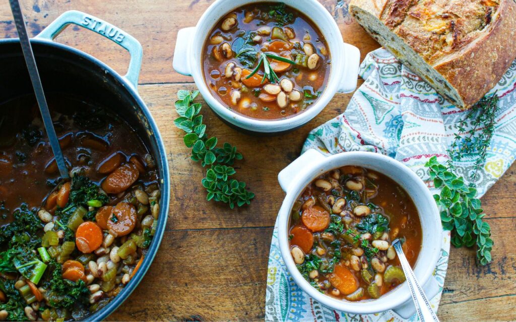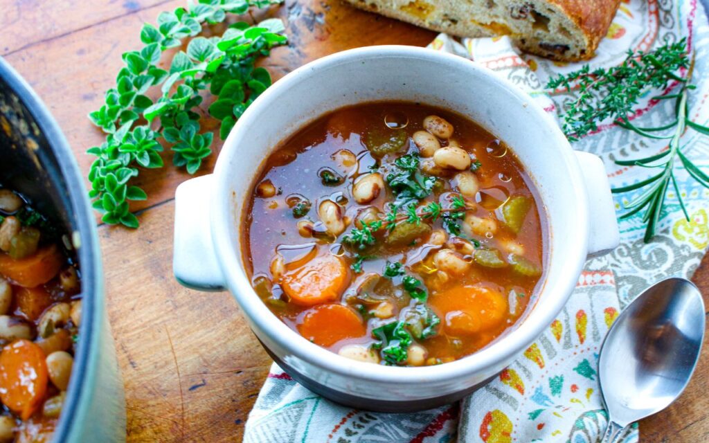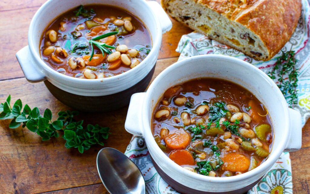 In the Mediterranean, you’ll find hearty bean stews and soups, like this Mediterranean Heirloom Bean Soup, whichare like a meal in a bowl, especially when paired with some crusty whole grain bread and perhaps a crisp green salad on the side. Filled with simmered beans and the flavors of onion, garlic, carrots, celery, and herbs, this soup calls out as sheer comfort in a bowl. Delicious, satisfying, and budget-friendly, you can see why these rustic soups are such a core of traditional diets over the eons. They offer a nutrition-packed meal that provides energy to face the day.