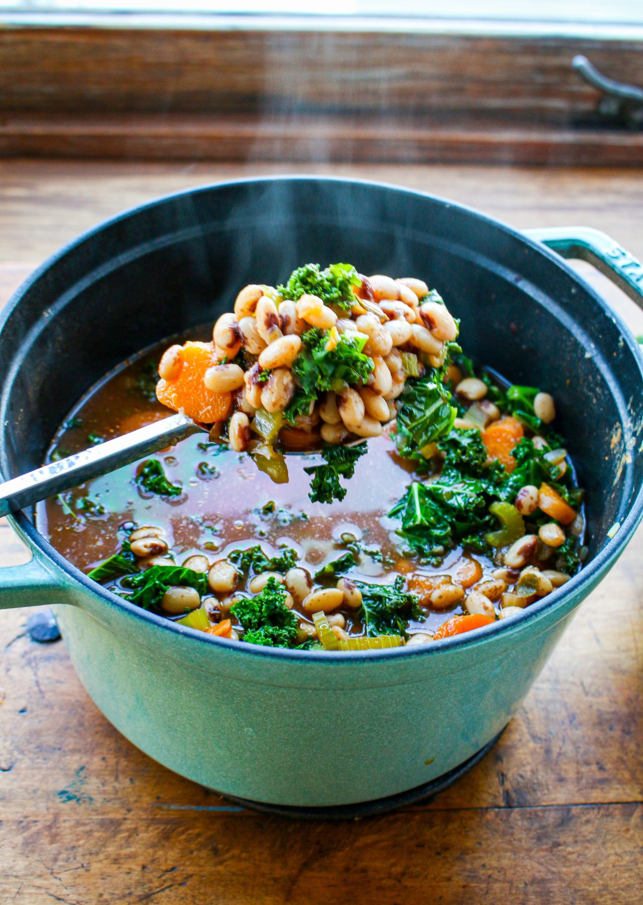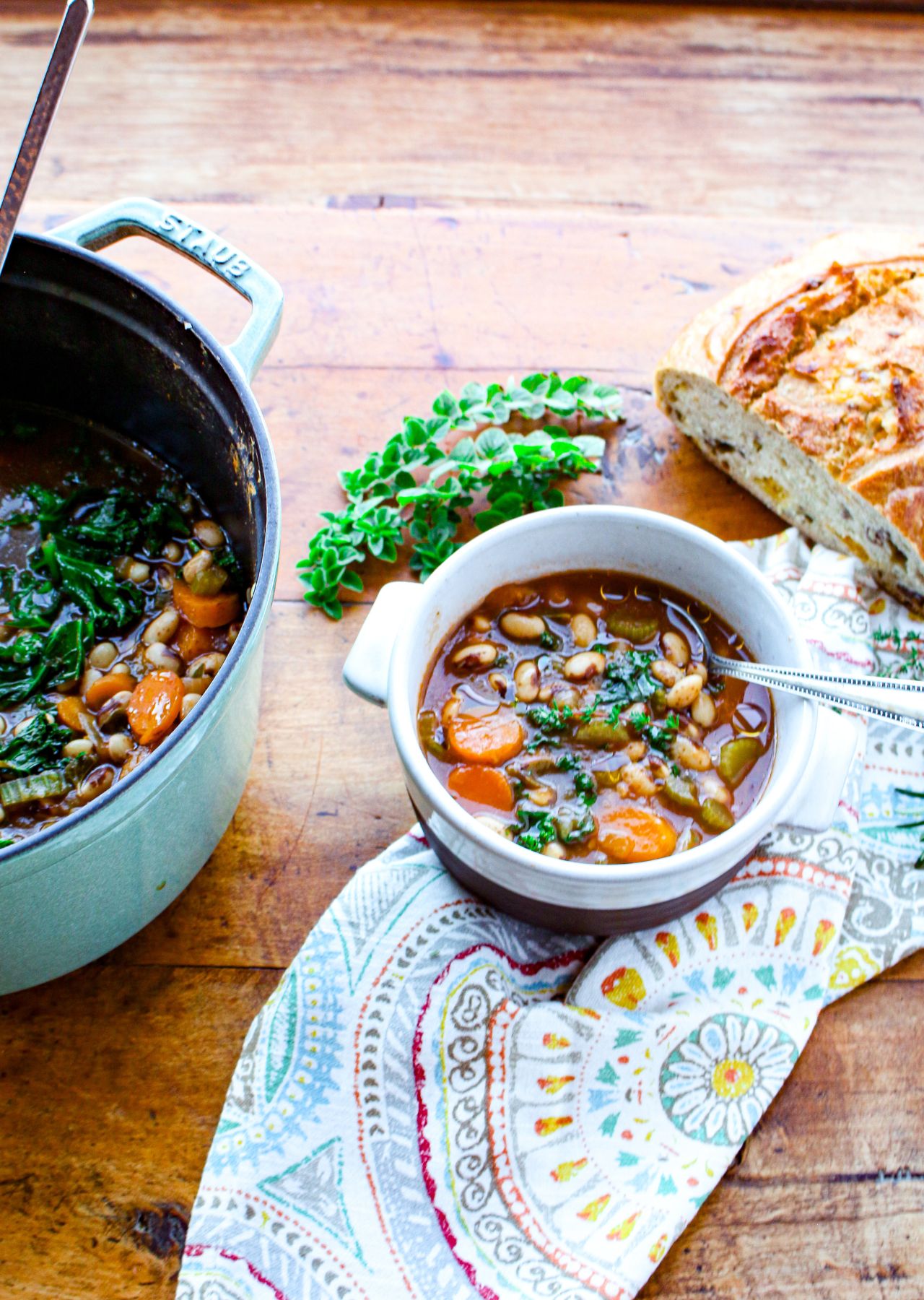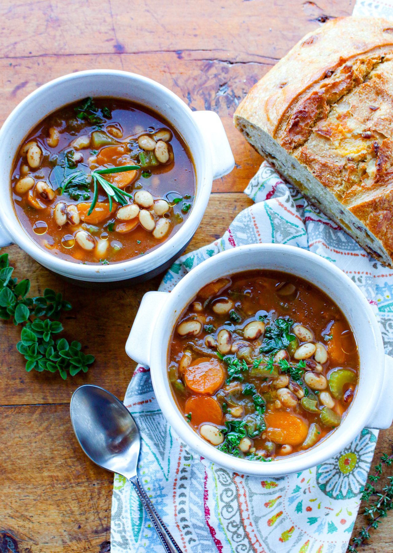 This vegan gluten free recipe for Mediterranean Heirloom Bean Soup is based on heirloom beans–unusual beans saved back by farmers from their crops for replanting, just like heirlooms. There is a world of unusual dried heirloom beans—Eye of the Goat, Rattlesnake, Flageolet beans. Though you can certainly swap out those heirloom beans for something you can find anywhere, such as dried cranberry, lima or cannellini beans. Heirloom beans are unusual varieties of beans that farmers found during their harvest, and would save the seeds back to replant the following year—essentially prized heirlooms! Maybe it was an offshoot with a vivid color, unusual pattern, or large form—whatever it was, the farmer selected that one plant to harvest its beans (which are also seeds for the next year) and plant it again, forever preserving the unique qualities of that bean plant. That’s why we have so many gorgeous, unique varieties of beans today! In this recipe, I used Eye of the Goat beans. But I have found so many cool beans at farmers markets and shops all over the world to bring back to my kitchen. With a long shelf life, you can collect heirloom beans to feature in your cooking all year long.