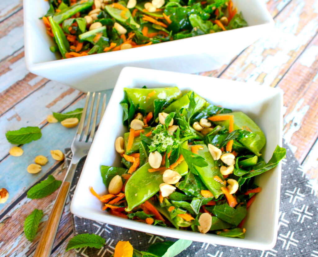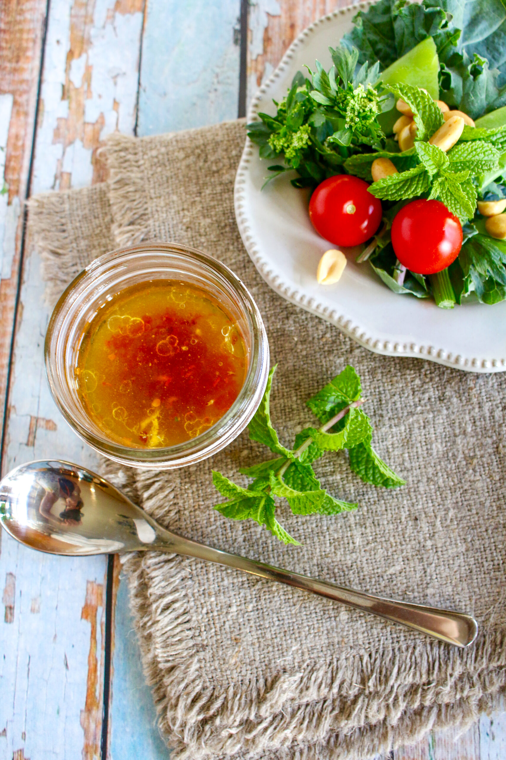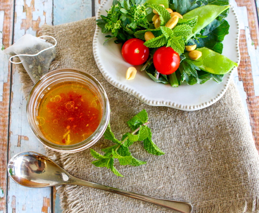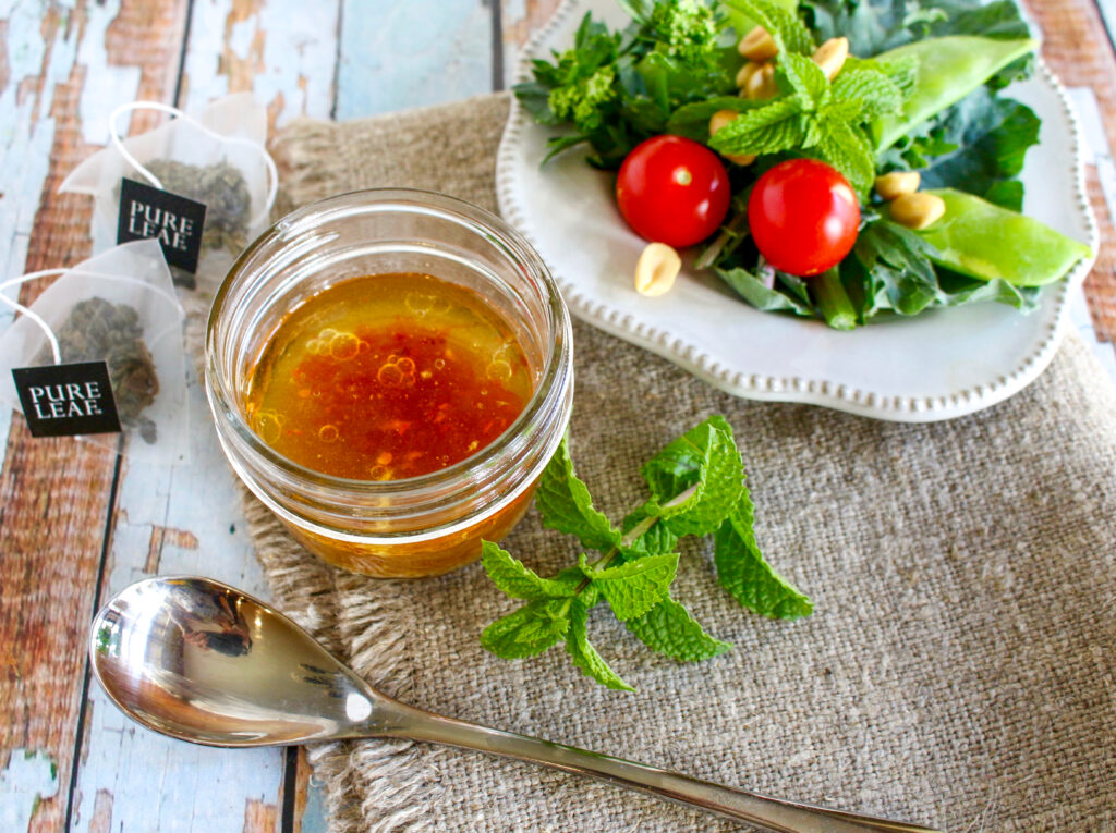 The astringency of green tea and freshness of mint come together to brighten up an Asian style vinaigrette, with ginger and red chili.