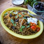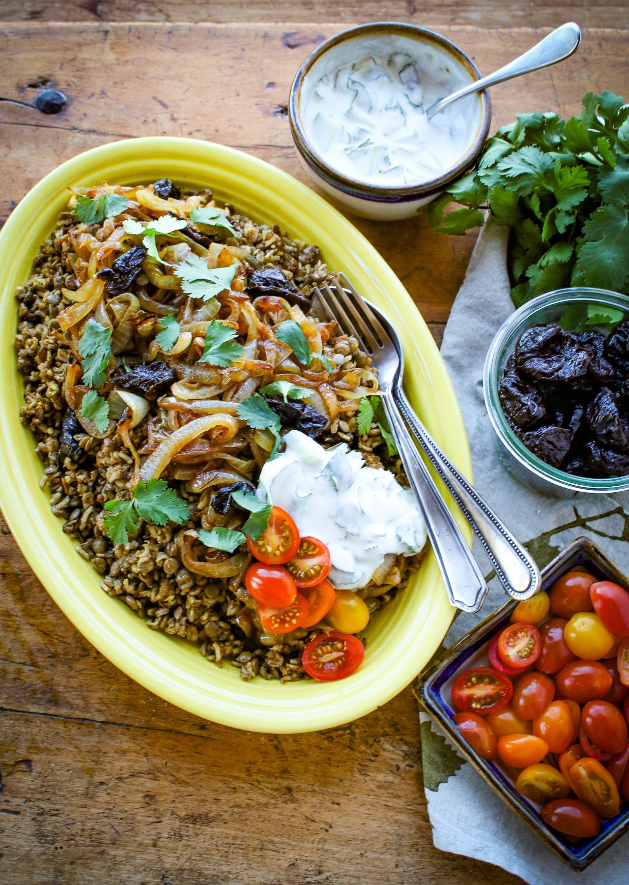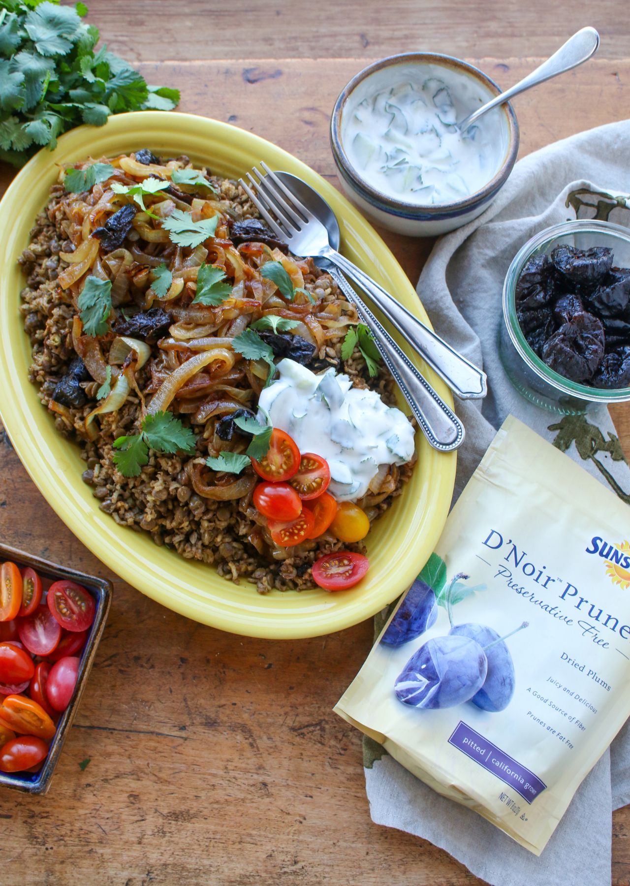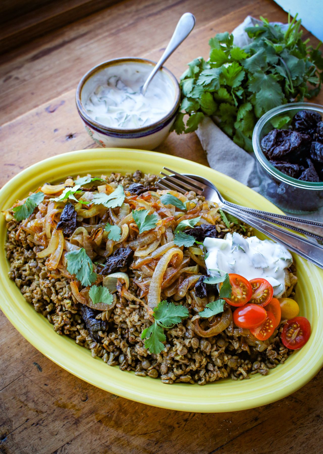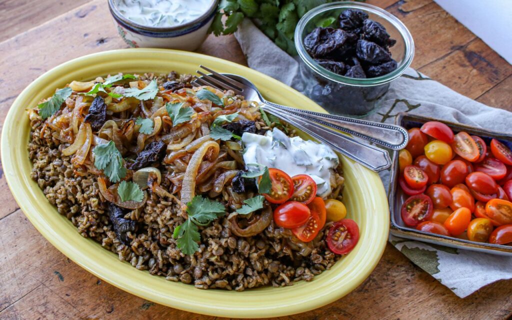 This plant-based, gluten-free recipe for Mujadara with Prunes and Yogurt Cucumber Sauce is based on the classic plant-based Middle Eastern dish featuring earthy lentils and rice topped with caramelized onions and served with a flavorful yogurt cucumber sauce.