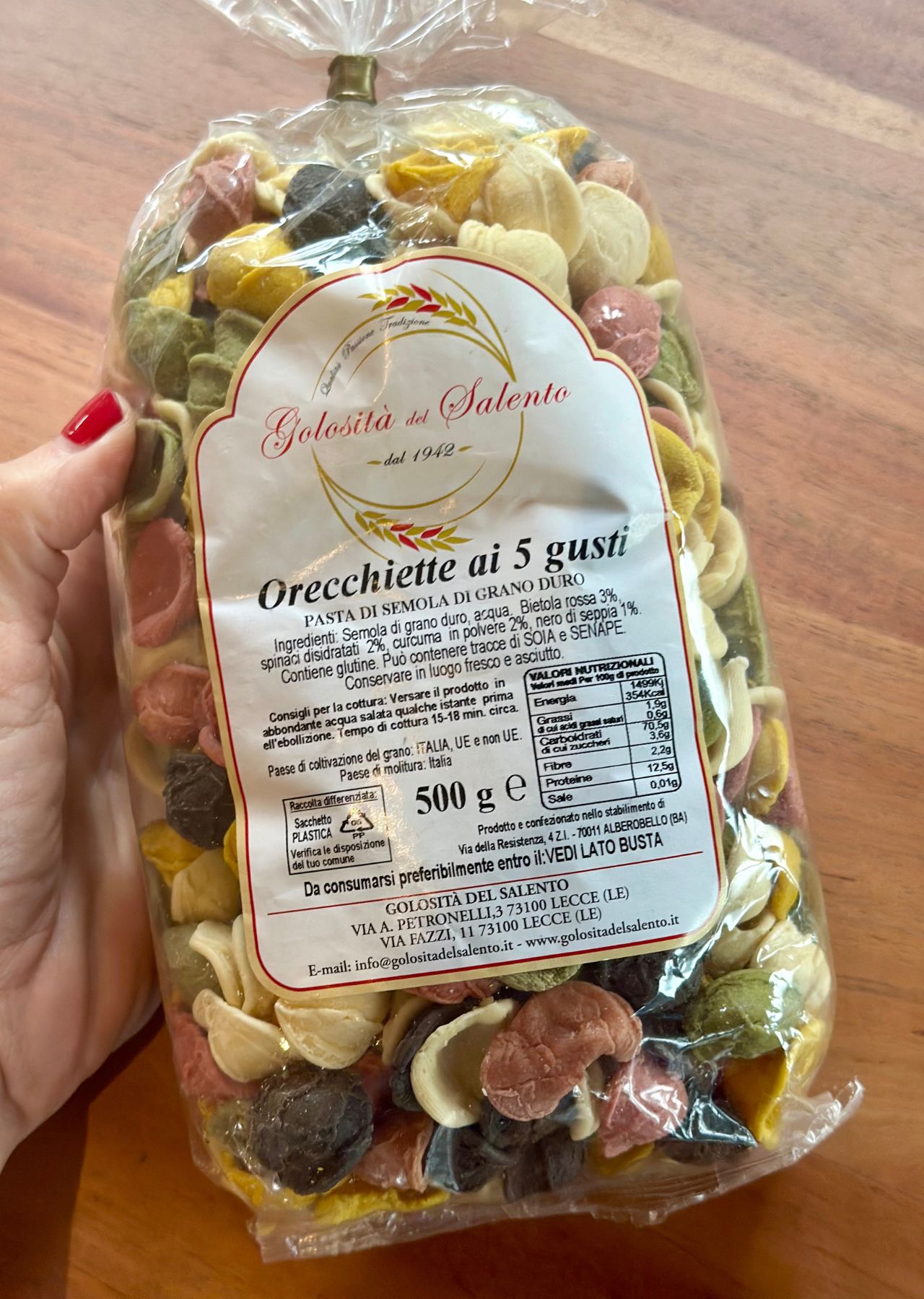 I bought this multi-colored orecchiette pasta in Puglia, Italy, where it originates.