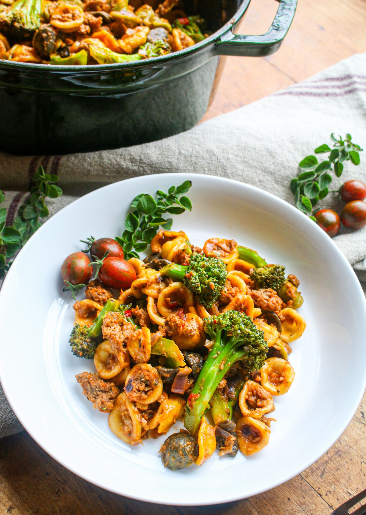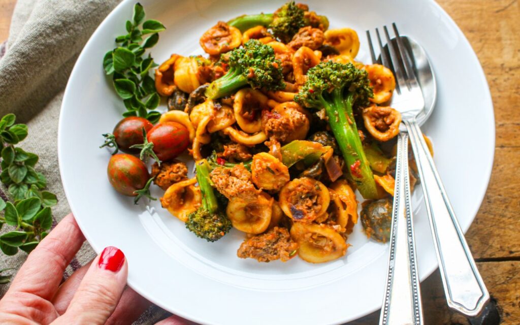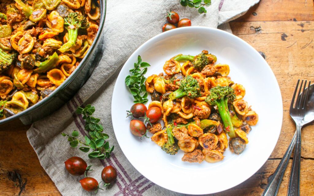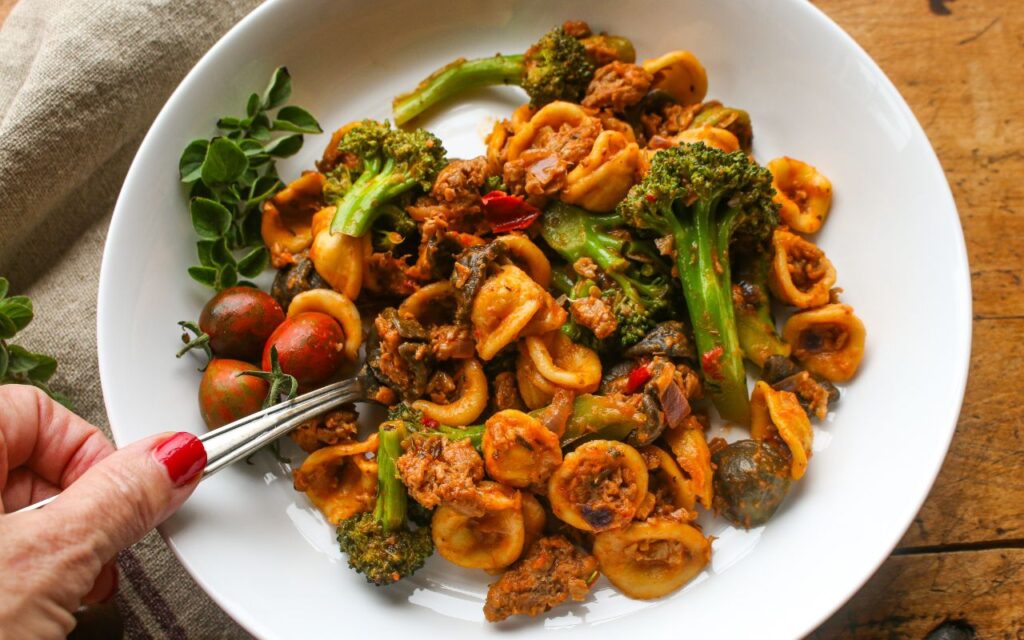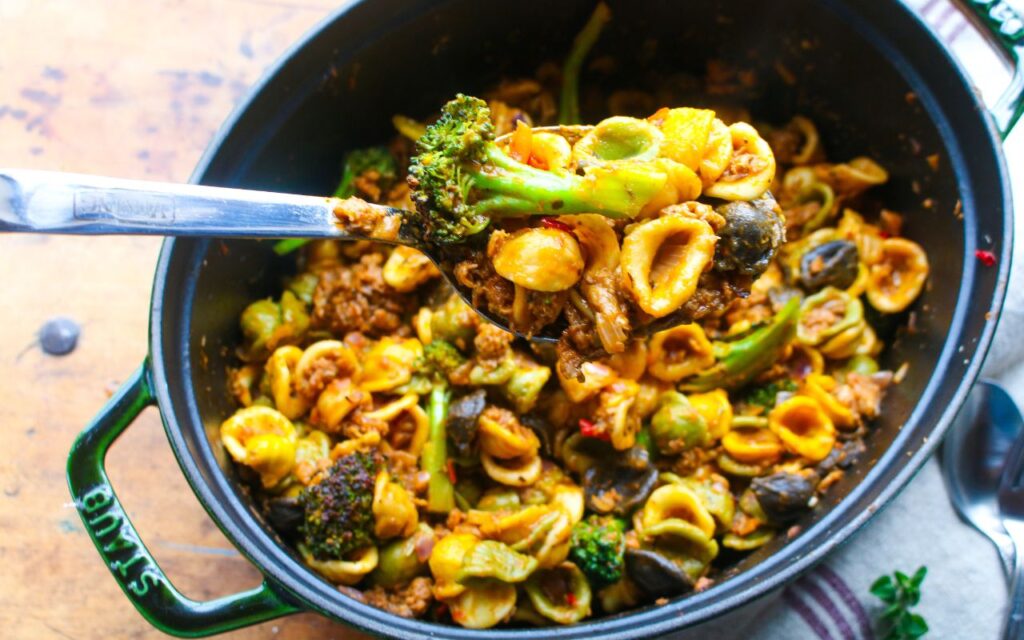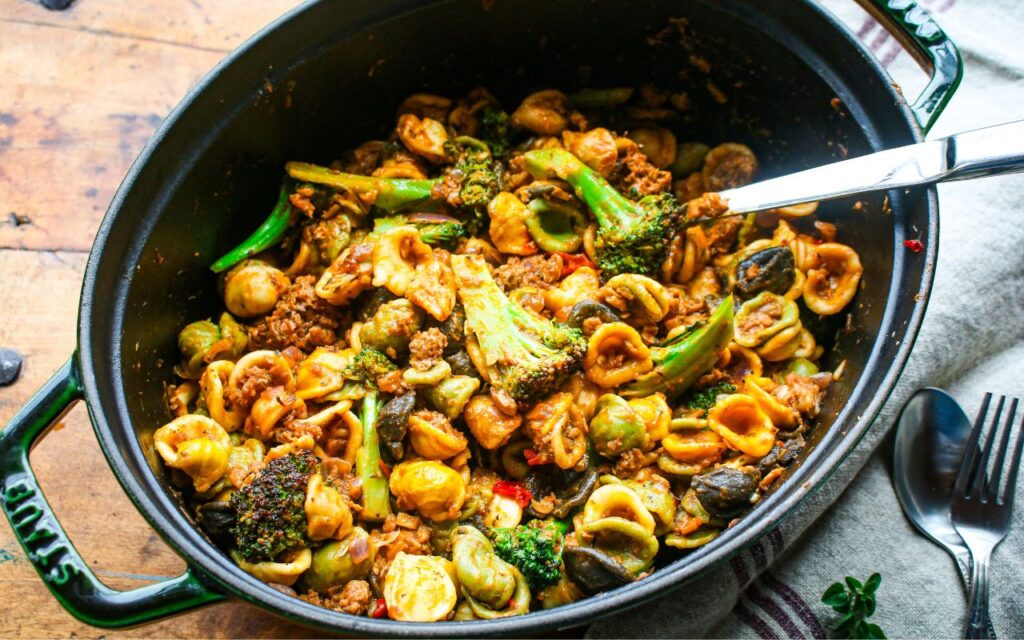 One Pot Vegan Orecchiette Pasta with Sausage and Broccoli