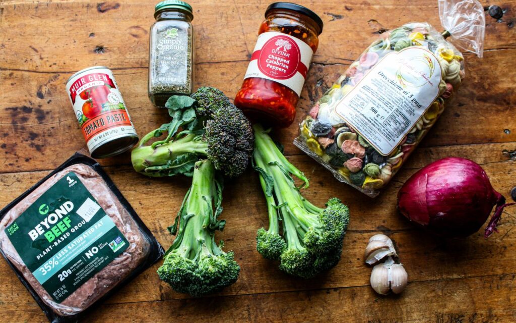 I was fortunate enough to visit Puglia and see the traditional orecchiette pasta-making practice in the town of Bari, Italy. It’s commonly available in its fresh form, but I also brought packages of dried pasta home with me to cook in my own kitchen. While I was in Puglia, I feasted on plant-based dishes with orecchiette every day! A common classic dish included broccoli rabe, tomatoes, chili peppers, and sausage, which inspired my plant-based recipe for One Pot Vegan Orecchiette Pasta with Sausage and Broccoli that I created in my kitchen. I turned to plant-based beef crumbles for this recipe. You can also substitute that with cooked brown lentils.
