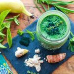 I created this super wholesome pea-powdered green smoothie filled with antioxidant and anti-inflammatory ingredients, including ginger, turmeric, fruit, and green powder. This makes it a perfect recovery snack to help reduce inflammation associated with exercise. This is a great, hearty pre- or post-workout smoothie, quick breakfast or snack on the go, or meal prep smoothie. I love to fill mason jars with this plant-powered smoothie and take it along with me wherever I’m going. Just reach into the fridge, snap up the smoothie, and out the door you go.