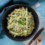 - Top with vegan shredded Parmesan cheese. Serve immediately. May chill and serve as a cold pesto pasta salad, if desired.