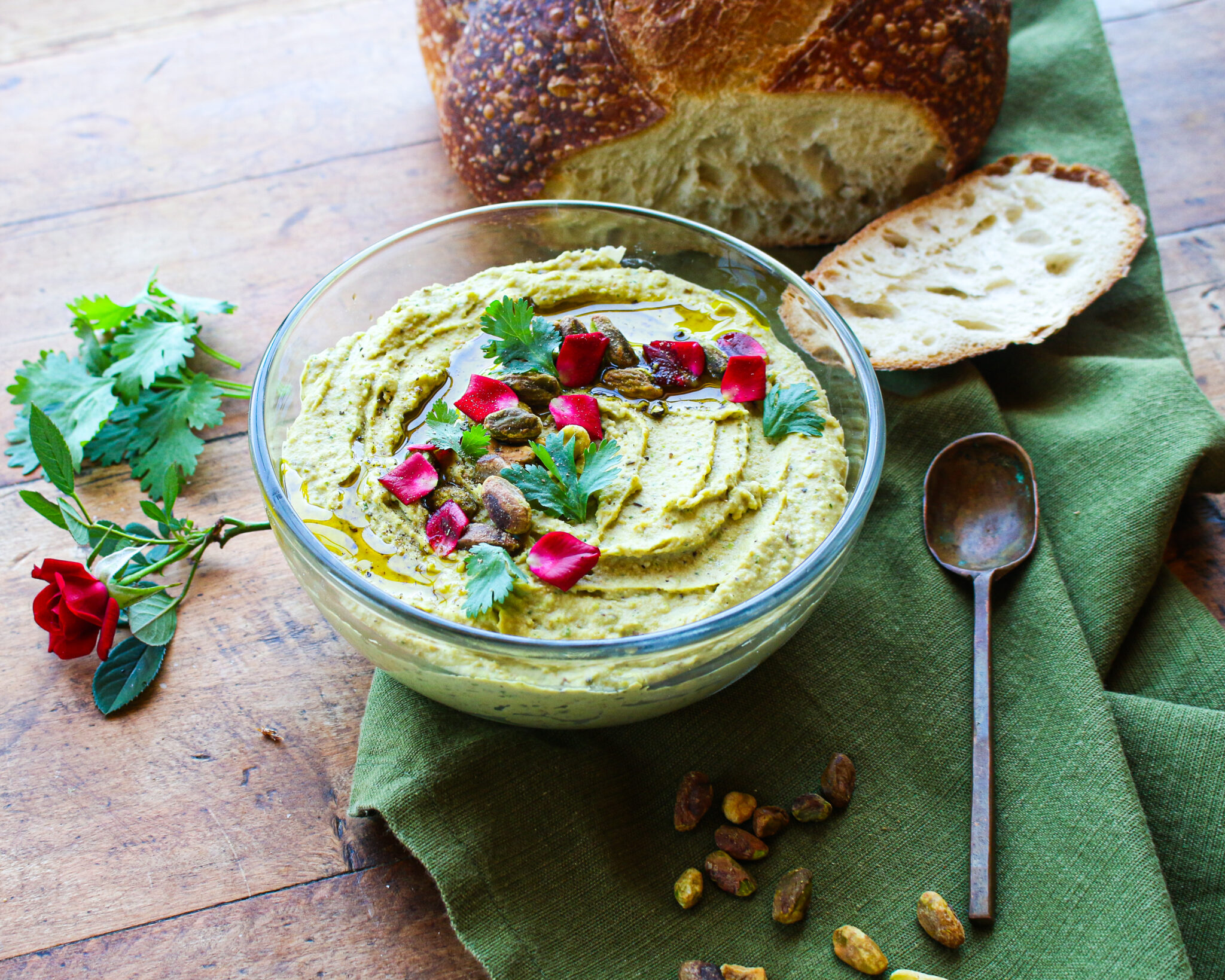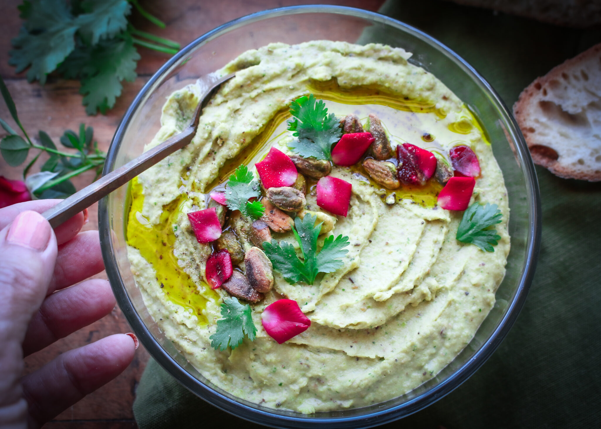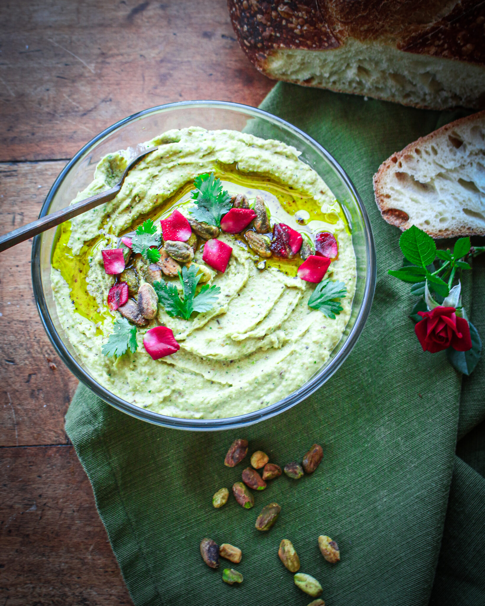 I garnished this hummus recipe with clean organically grown rose petals, which is a traditional ingredient in Mediterranean foodways.