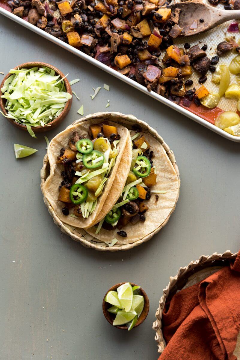 Warm the tortillas in either the microwave or on a hot pan until soft and pliable. Fill each one with some butternut– black bean mixture, then top with tomatillos, shredded cabbage, and jalapeño slices. Serve warm, accompanied by lime wedges.
