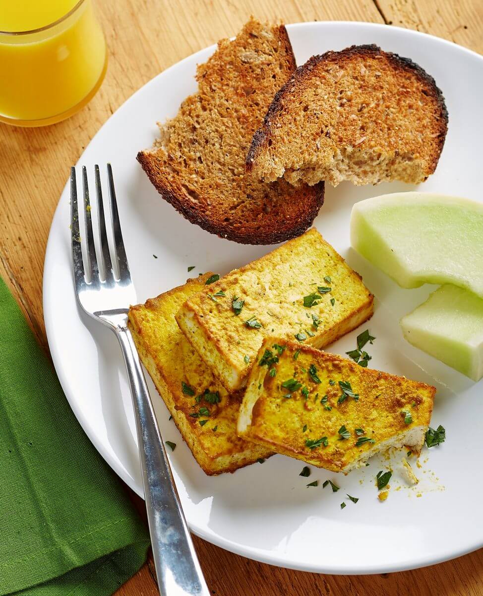 This breakfast tofu is a mobile version of a tofu scramble, which—while delicious—doesn’t travel well and requires stovetop supervision. Wrap a couple of slices of this tofu in a brown rice tortilla, or sandwich it between two slices of sprouted grain bread with loads of arugula, avocado, and even a few leftover cold roasted root veggies. If you make a big batch on the weekend, you can have your weekday breakfasts prepped and ready to go in three minutes flat. Although we prefer to serve this tofu at room temperature or cold from the fridge (it firms up as it cools), it can be eaten right away, too.