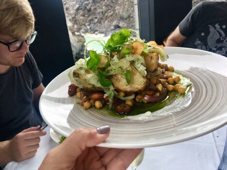 Check out this setting—that’s the blue lagoon just peeking through the windows. And here’s my scrumptious entrée: Chickpeas with Jerusalem artichokes and pea tendrils. See what I mean about amazing food?