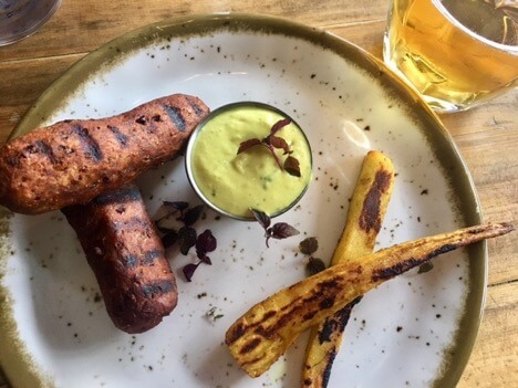 How delightful to find some plant-based pubfood here, such as vegan sausages with a turmeric dip and roasted carrots. This is pubfood in Reykjavik!