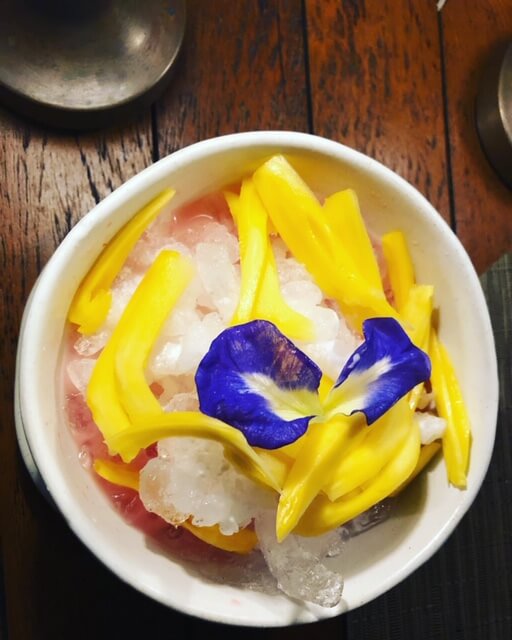 This was an iced dessert with mangos and butterfly pea flowers.
