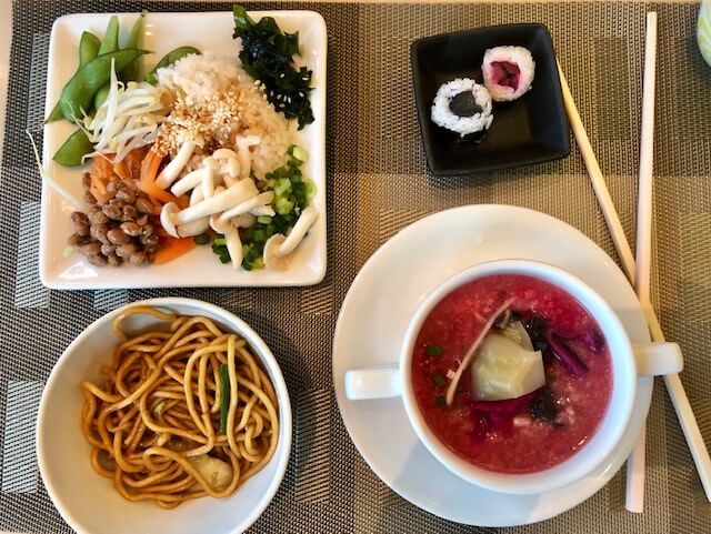 My first stop was in Bangkok, where we stayed at the Westin. What an experience Thai breakfasts are! It’s all about veggies! I had a variety of Asian veggies, some noodles, vegetable sushi, and the wonderful breakfast porridge Congee—this one (on bottom right) was flavored with beets!