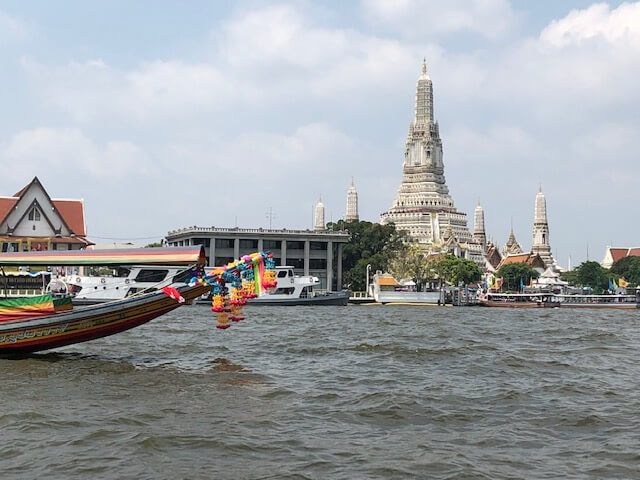 Our first morning, we set out to see all of the most important temples and palaces of Bangkok via a boat ride along the river. It’s a nice way to see the city and get some fresh air (it’s pretty hot and muggy in Bangkok!). Here is our first glimpse of the amazing Wat Arun, the iconic 17th century temple along the river that is lit up at night.
