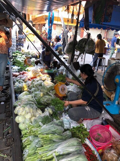 The next day we ventured out to the famous Maeklong Railway Market, where the farmers and vendors display their produce right on the train tracks. When the trains come by, they have to move out of the way!