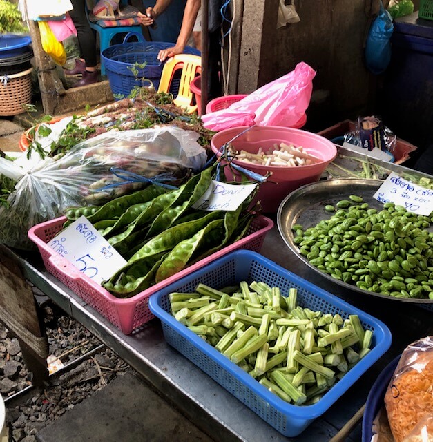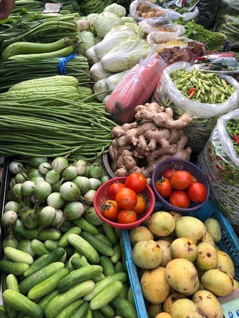 This picture also shows the classic vegetables in most Thai cuisine, including cucumbers, tomatoes, small white eggplants, long beans, ginger, carrots, cabbage, peppers, bitter melon, and greens.