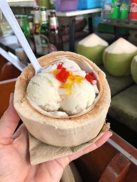 On our floating market trip, we shared this beautiful coconut ice cream, topped with jellied fruits and served in a coconut shell.
