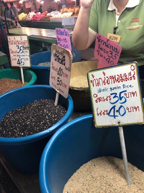 We learned about all of the types of rice—sticky, jasmine, brown, red, white—and their significance to Thai cooking at the farmers market.