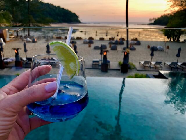 Yes, that’s a butterfly pea flower beverage served to me at sunset on my first night in Phuket!