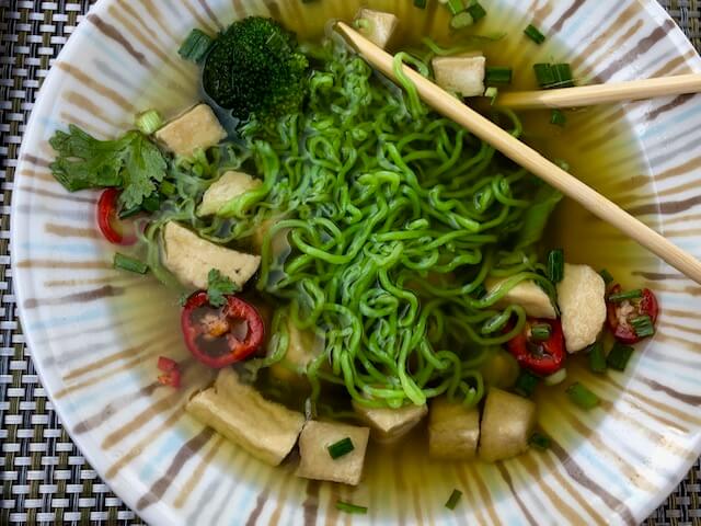 You know I’m crazy about veggies for breakfast, so these green noodles with tofu, veggies, and spices was my go to.
