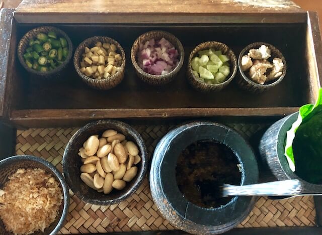 We had this appetizer dish every night—I loved it. It starts with betel leaves (on right), and then you fill it with toppings taco style: coconut, peanuts, chilis, onions, lime, ginger, garlic. Yum!