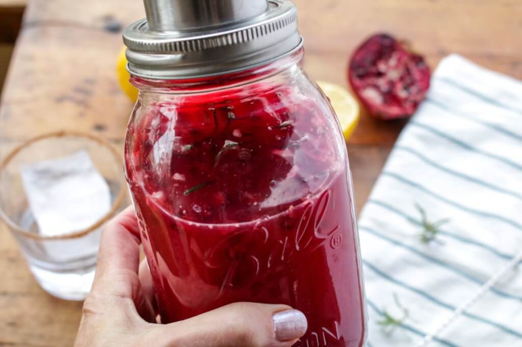 - Place pomegranate juice, lemon juice, agave syrup, silver tequila, and pomegranate arils, and fresh rosemary sprigs in a shaker container or pitcher.