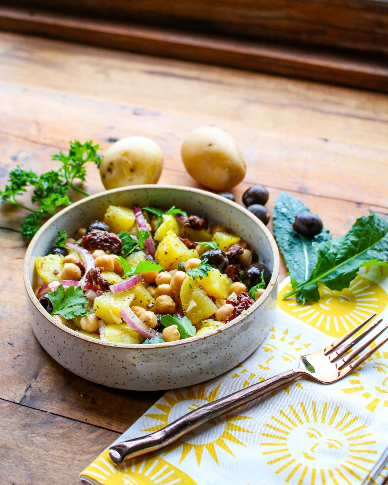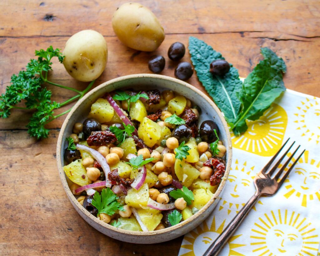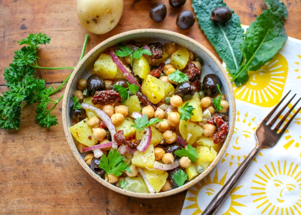 This simple, easy Mediterranean salad is based on the classic ingredients of potatoes, beans, olives, sun-dried tomatoes, capers, garlic, onions, herbs, and a light olive oil vinaigrette. It’s like a touch of sunshine, yet the ingredients are seasonally available year-round. Based on plant-based staples you can easily store on hand, this is a great recipe to turn to any time of the week. Its rustic simplicity makes it perfect for a weeknight dinner, but its understated elegance means it’s also ideal for parties, picnics, and celebrations. It’s delicious served warm, or chilled—and it stays fresh for a few days in the fridge, as the flavors continue to meld. Use your favorite canned bean in this recipe. I featured garbanzo beans (chickpeas), but it’s also delicious with kidney beans, cannellini beans, and red beans. You can get this salad done in 30 minutes, too!