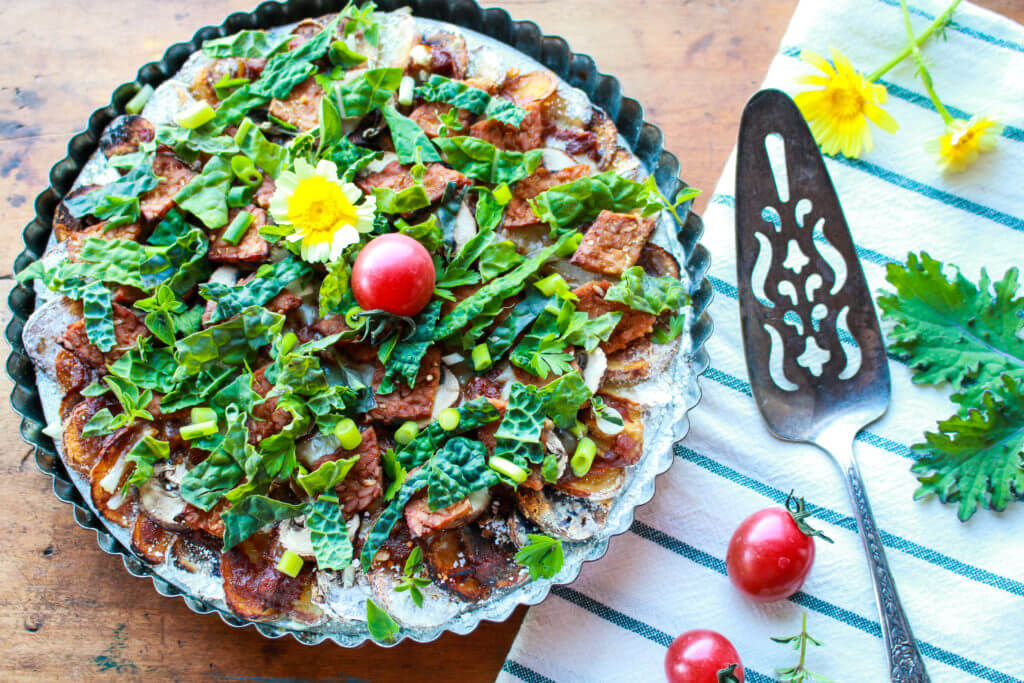 This fabulous plant-based pizza recipe is as satisfying as it is pretty—the multi-colored potatoes forming a crust showcase rich, savory layers of marinara, plant-based cheese, smoky tempeh, greens and herbs.