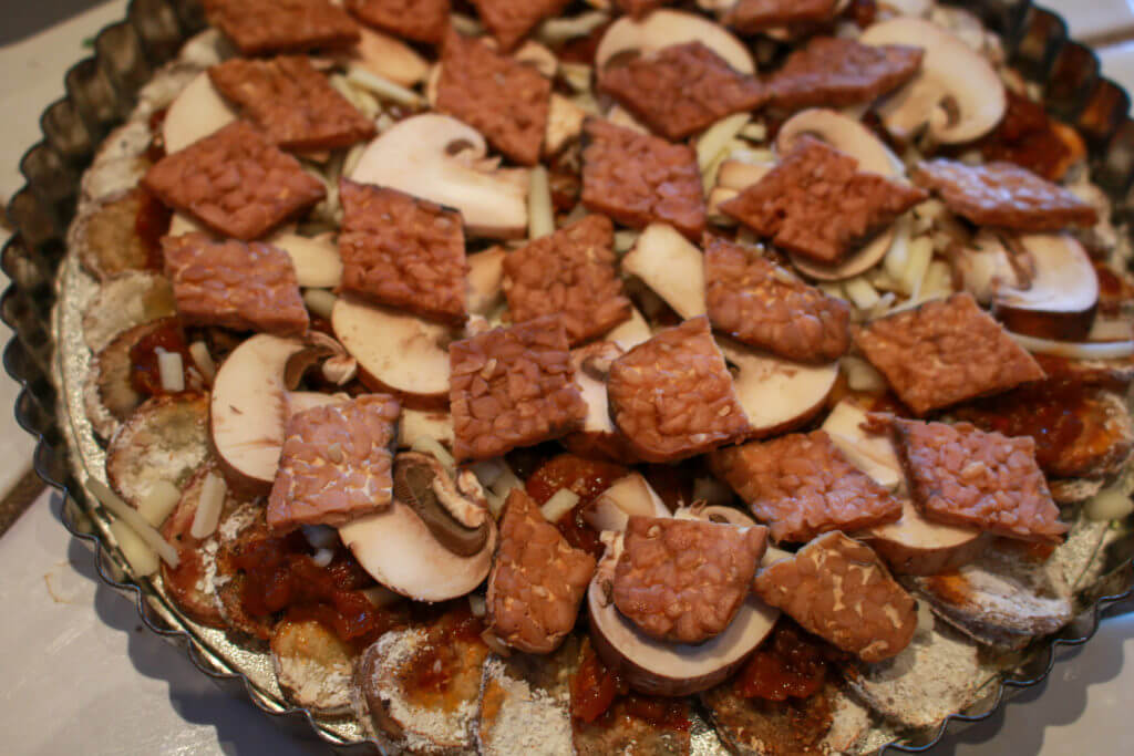 - Remove the potato crust from oven and spread gently and evenly over the surface with marinara sauce. Sprinkle with dried oregano. Arrange plant-based cheese, mushrooms, and tempeh bacon evenly over surface.
