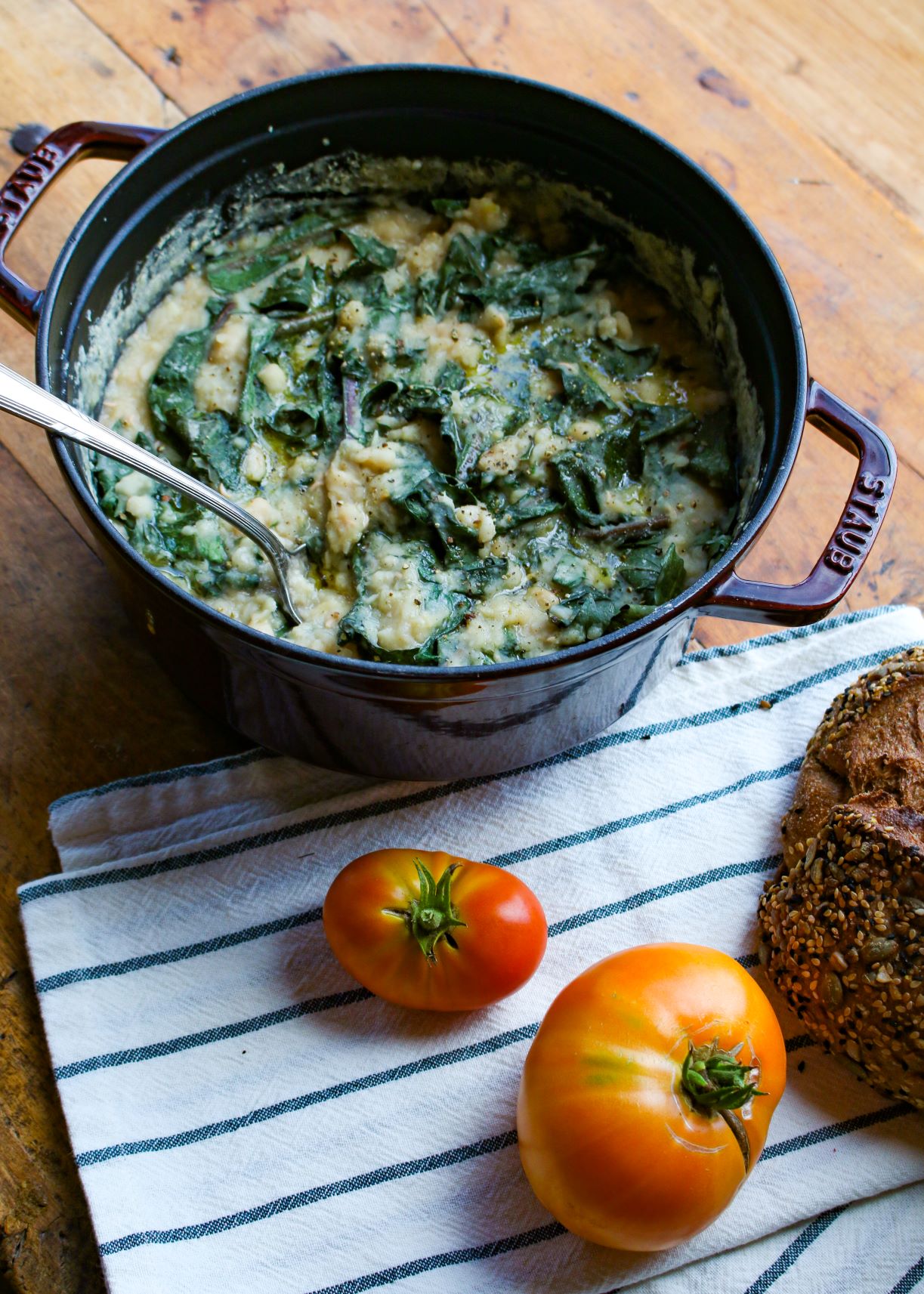 Just soak the beans overnight, cook with fresh water and broth with onion and a few seasonings until tender, mash until soft, and top with the greens to let wilt. Drizzle with olive oil and dig in!